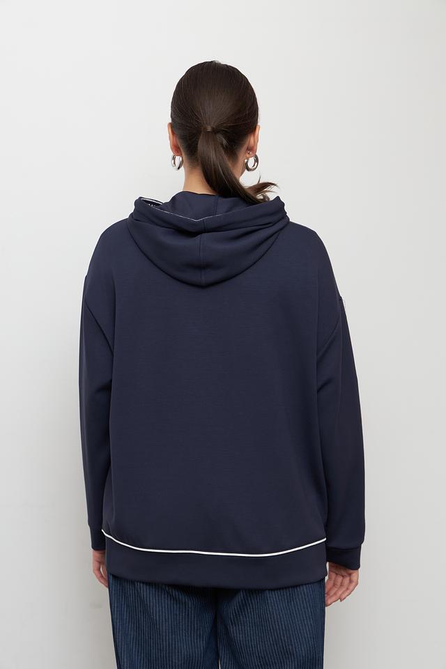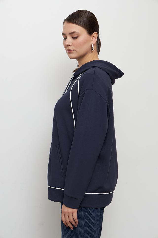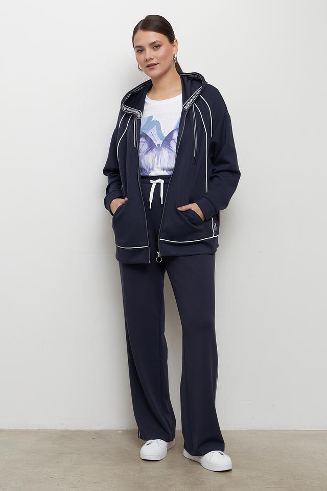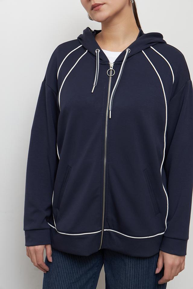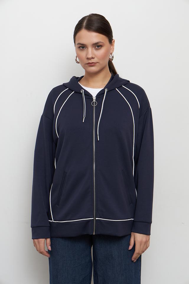 Женский жакет Lebek темно-синего цвета с застежкой на молнию и капюшоном. Модель выполнена из мягкой ткани с контрастными белыми полосами, имеет удобные карманы и свободный крой. Состав: полиэстер 50%, вискоза 45%, эластан 5%