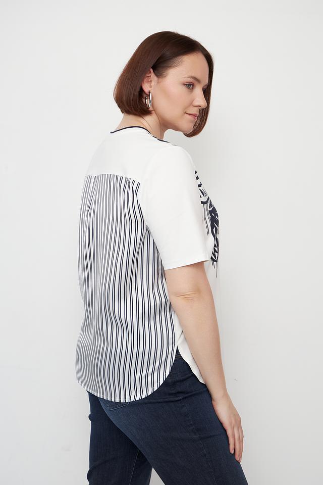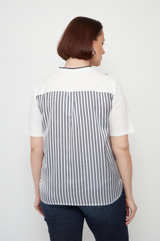Блуза имеет свободный крой, короткие рукава и округлый вырез горловины. Спинка блузы выполнена из полосатой ткани в тонкую синюю полоску. Асимметричный низ добавляет оригинальности модели.