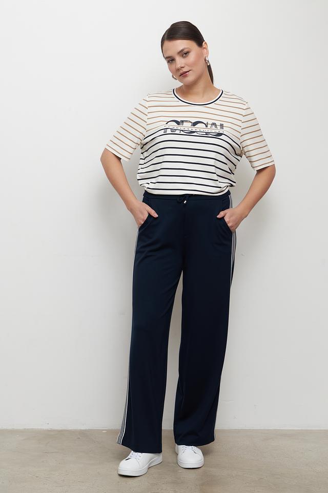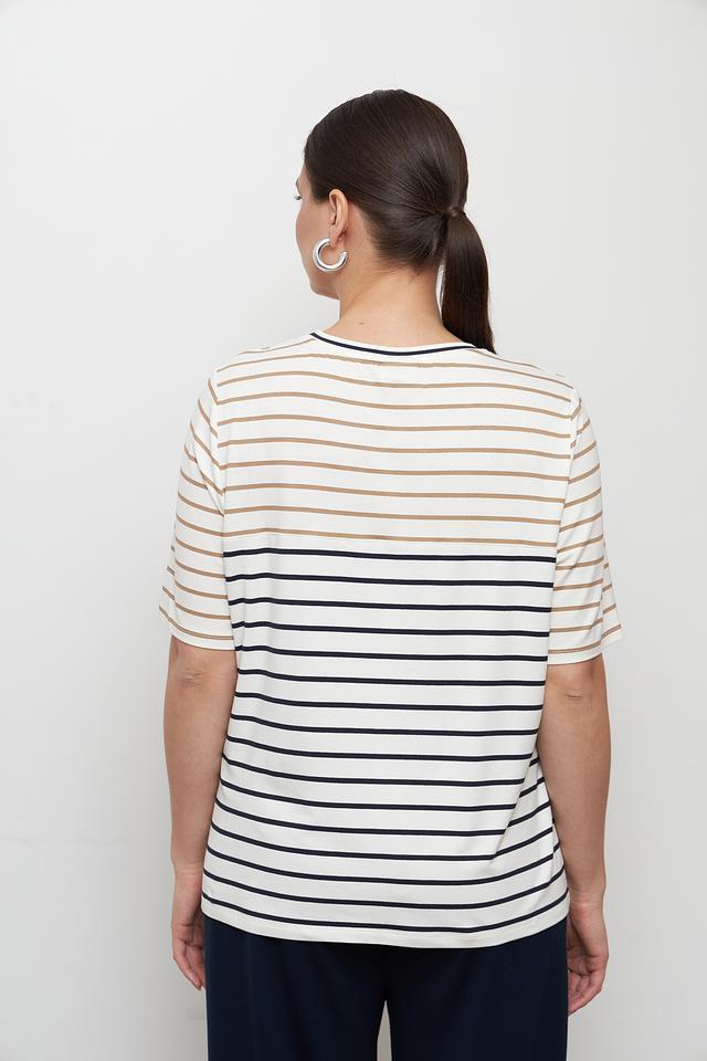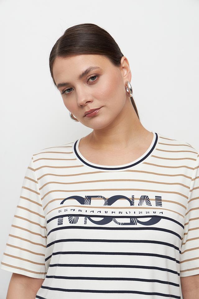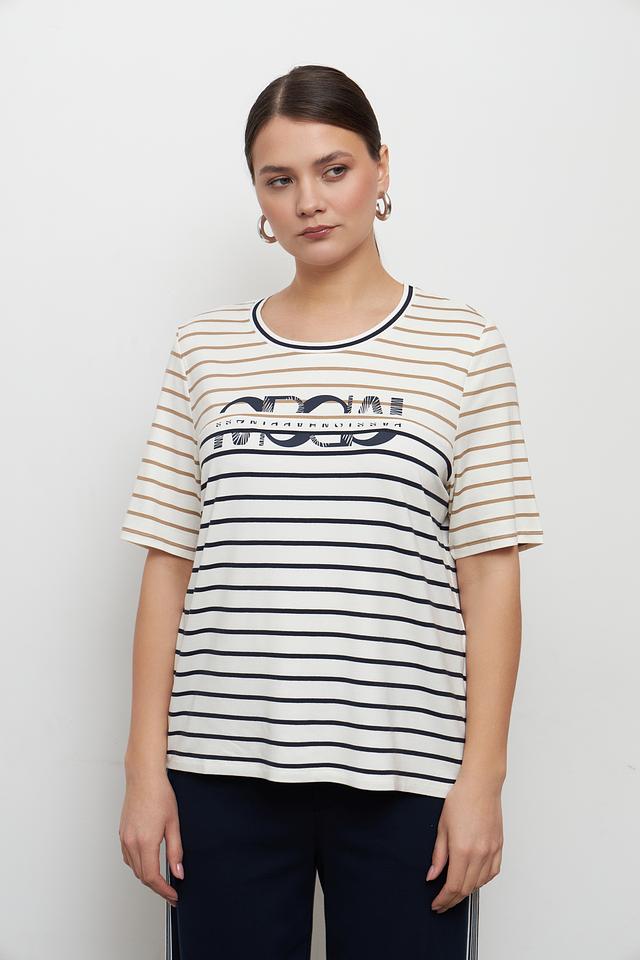 Женская футболка Lebek бежево-синего цвета в горизонтальную полоску с принтом на груди. Изготовлена из мягкой вискозы с добавлением эластана для комфортной посадки и свободы движений. Состав: вискоза 92%, эластан 8%
