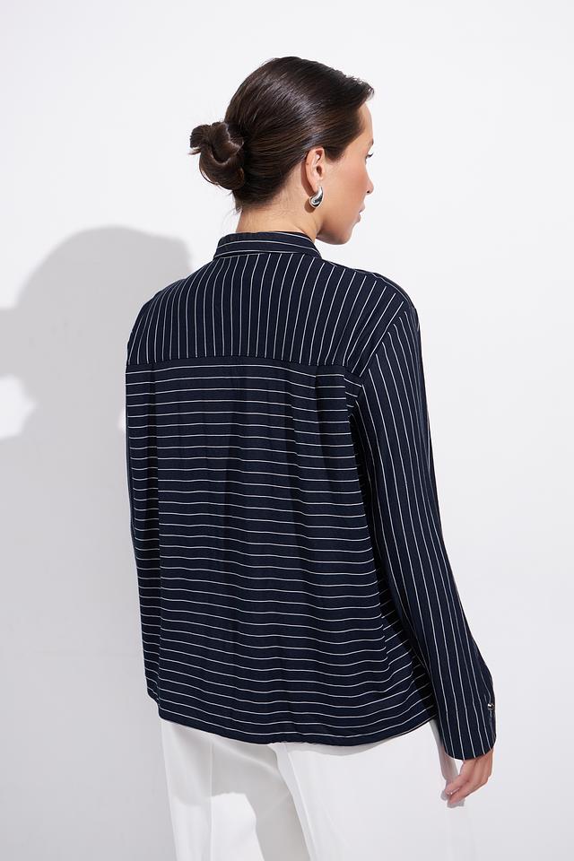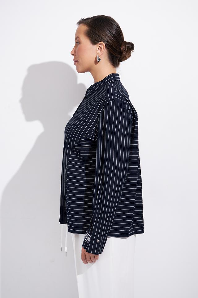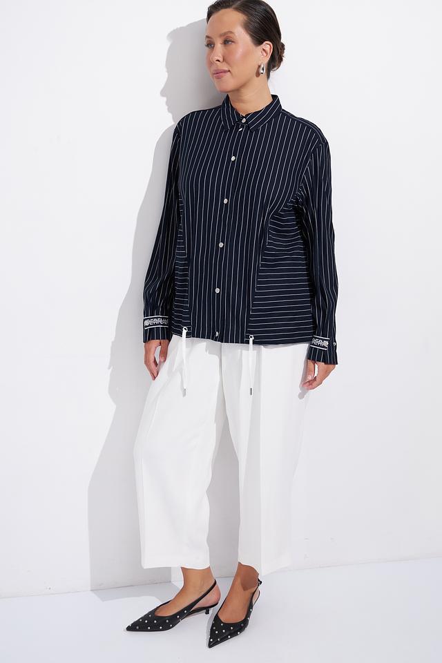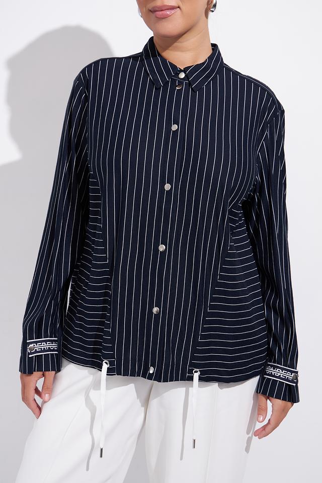 Блуза Lebek темно-синего цвета в белую полоску – стильная и удобная модель с воротником-стойкой и длинными рукавами. Изготовлена из приятной на ощупь ткани, идеально подходит для создания повседневных образов. Состав: вискоза 46%, полиамид 42%, полиэстер 12%