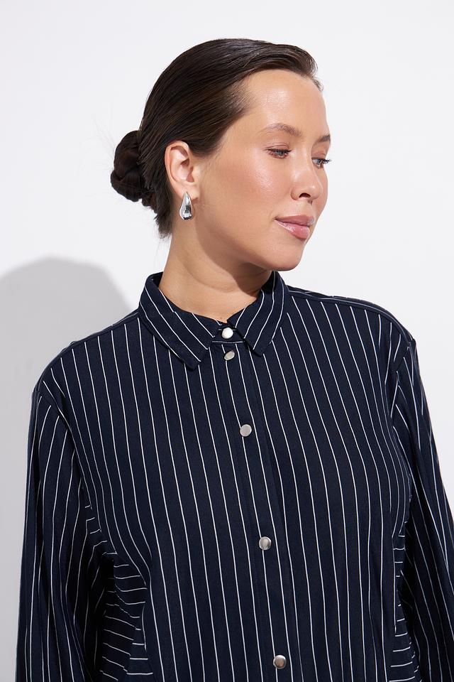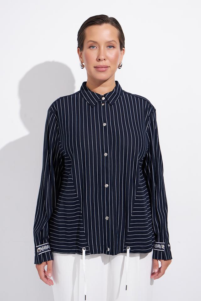 Эта блуза от Lebek станет отличным дополнением к вашему гардеробу. Выполнена в классическом стиле с вертикальной полоской, сочетающей темно-синий и белый цвета.