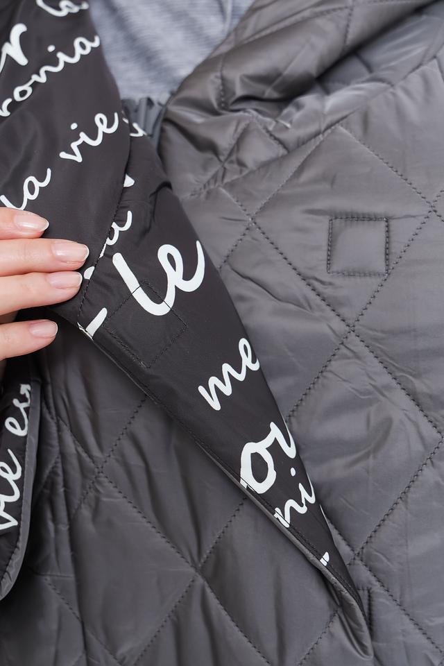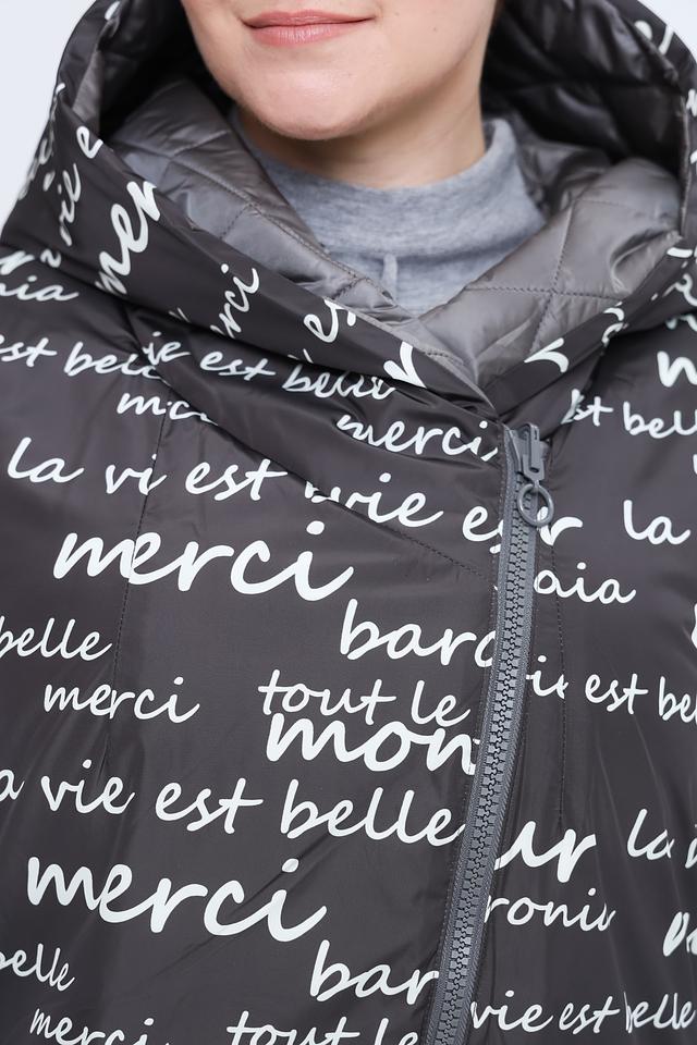 Основной цвет пальто – серый, но его уникальность заключается в ярком и необычном принте, покрывающем часть изделия. Принт выполнен в виде надписей на французском языке, что придает пальто особый шарм и индивидуальность.
