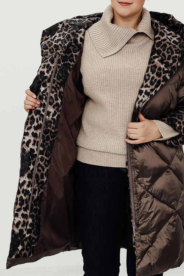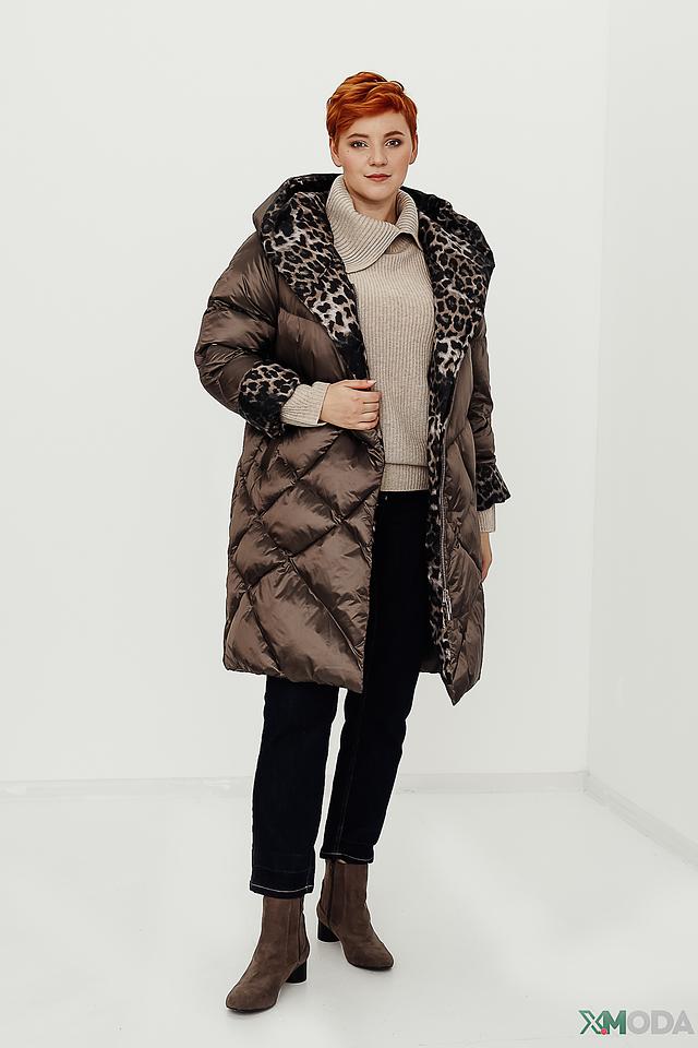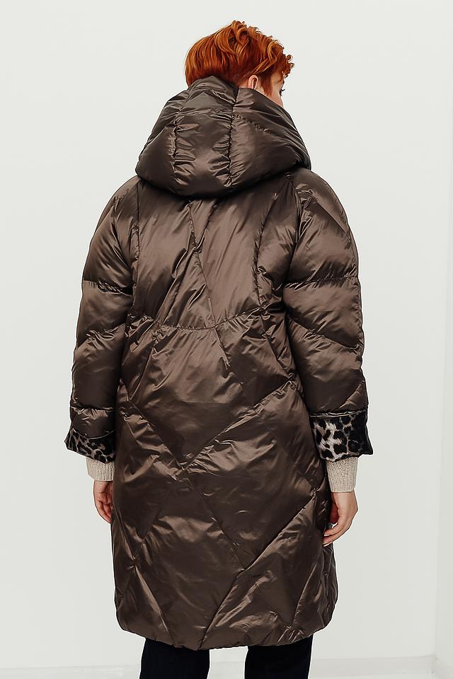 Пальто имеет стеганую фактуру, которая придает ему современный вид и обеспечивает дополнительное тепло. Капюшон не отстегивается, а его внутренняя часть отделана искусственным мехом с леопардовым рисунком, что добавляет образу роскоши и индивидуальности.