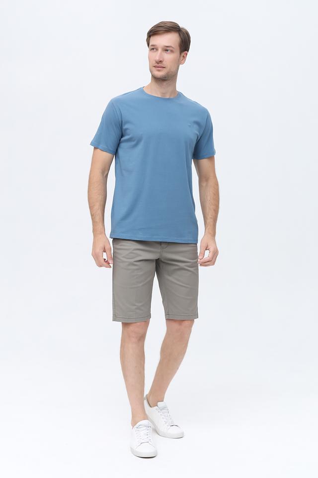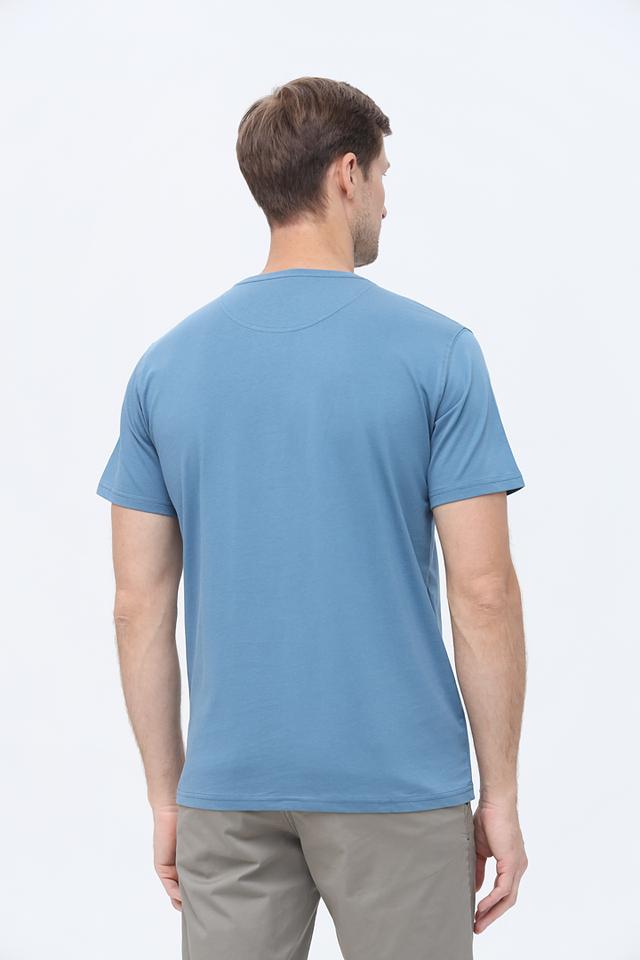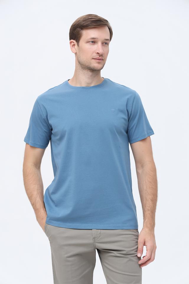 Цвет футболки – голубой, спокойный и универсальный, легко сочетается с различными элементами гардероба. Минималистичный дизайн дополнен небольшим логотипом бренда на груди. Круглый вырез горловины и короткие рукава делают эту футболку идеальным выбором для теплой погоды.