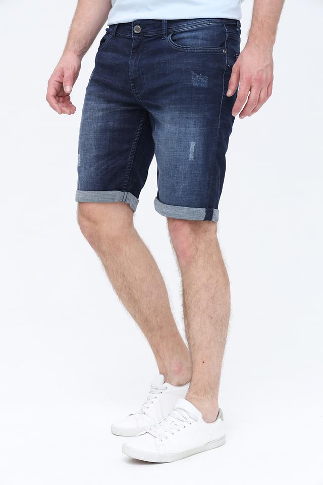 Мужские шорты Basefield синего цвета с эффектом потертостей и рваными деталями. Модель выполнена из качественного хлопка с добавлением эластана для комфорта и свободы движений. Состав: хлопок 98%, эластан 2%