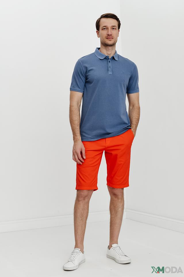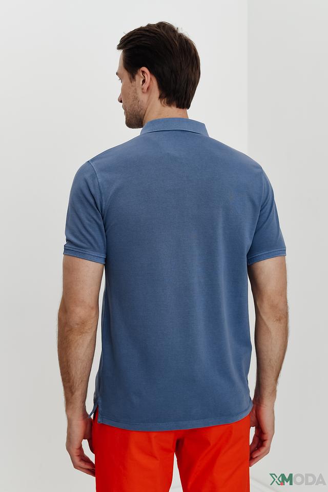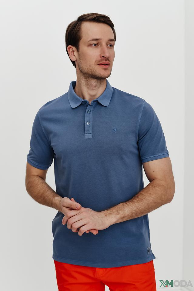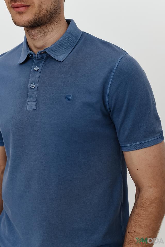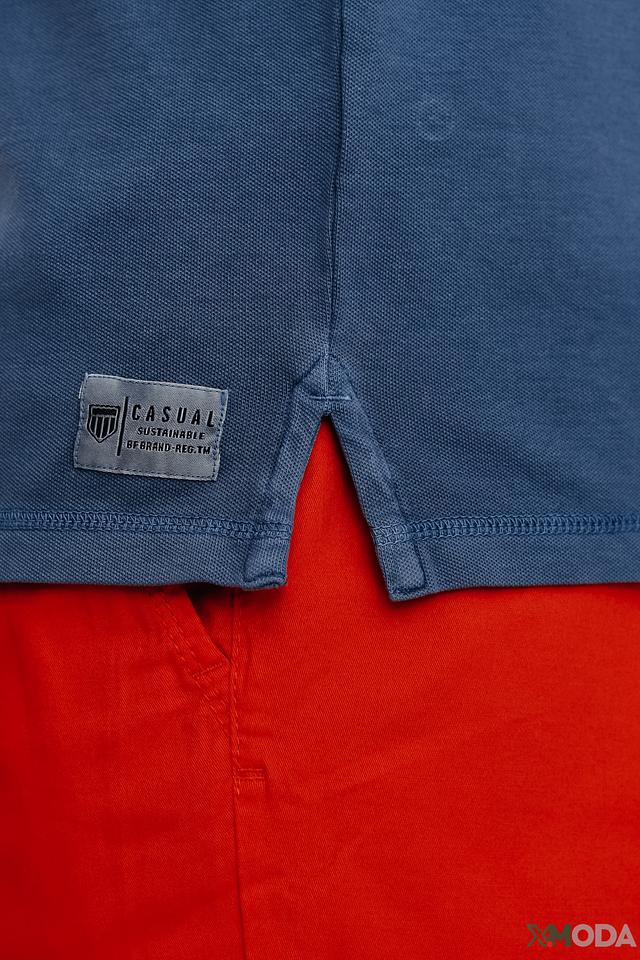 Поло имеет классический крой, короткие рукава и воротник-поло с тремя пуговицами. На груди расположена небольшая вышивка с логотипом бренда. Синий цвет поло делает его универсальным элементом гардероба, который легко сочетается с различными брюками и шортами.