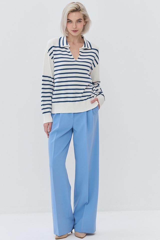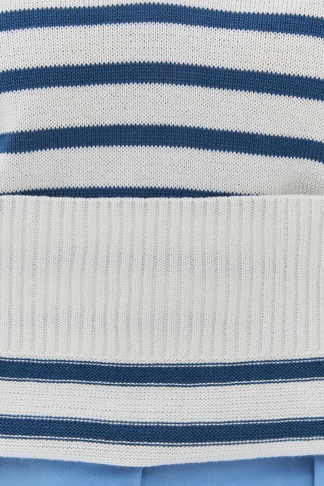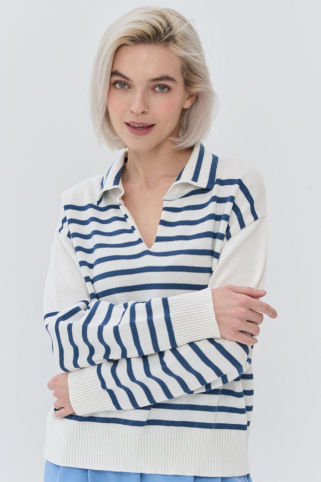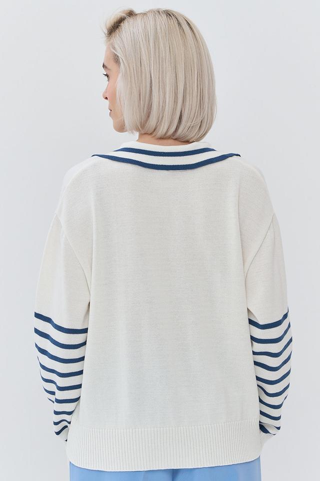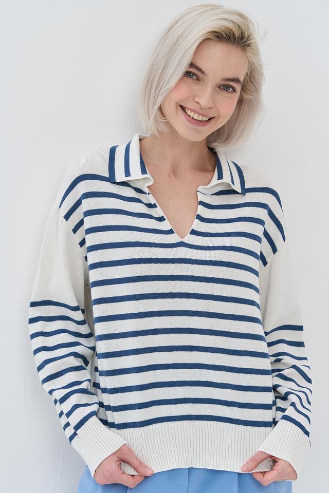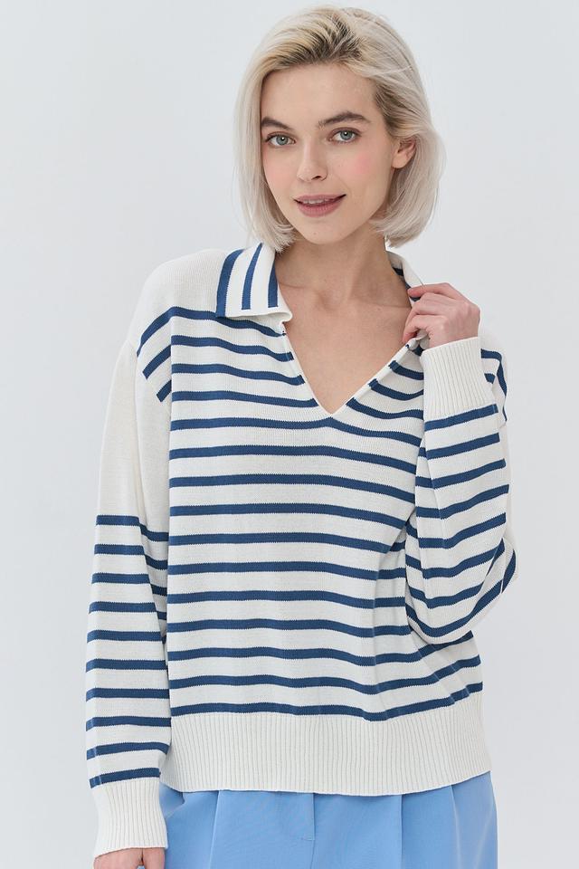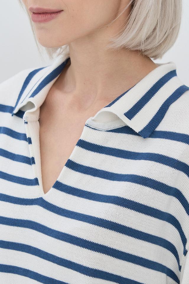 Женский джемпер BE YOU синего и белого цвета с полосатым узором и воротником-поло. Модель выполнена из мягкого и приятного к телу сочетания хлопка и пан. Стильный и комфортный выбор для повседневного гардероба. Состав: хлопок 50%, пан 50%