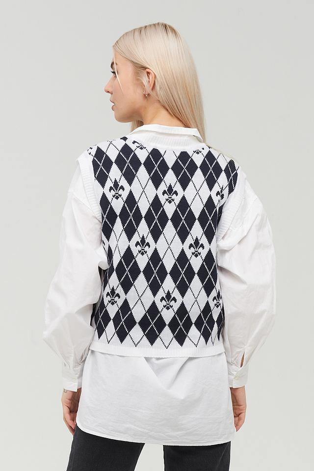 Женский жилет BE YOU чёрно-белого цвета с ромбовидным узором и узором "лилия". Модель выполнена из мягкой пряжи с добавлением шерсти, что обеспечивает комфорт и тепло. Идеально дополнит повседневный образ. Состав: пан 70%, шерсть 30%