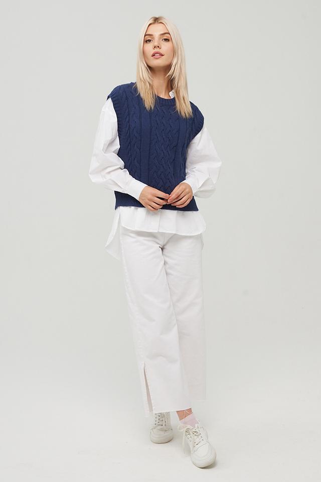 Жилет имеет классический силуэт и круглый вырез горловины. Его отличает рельефный узор в виде кос, который придает изделию текстуру и визуальный интерес. Синий цвет делает его универсальным и легко сочетаемым с различными элементами одежды.