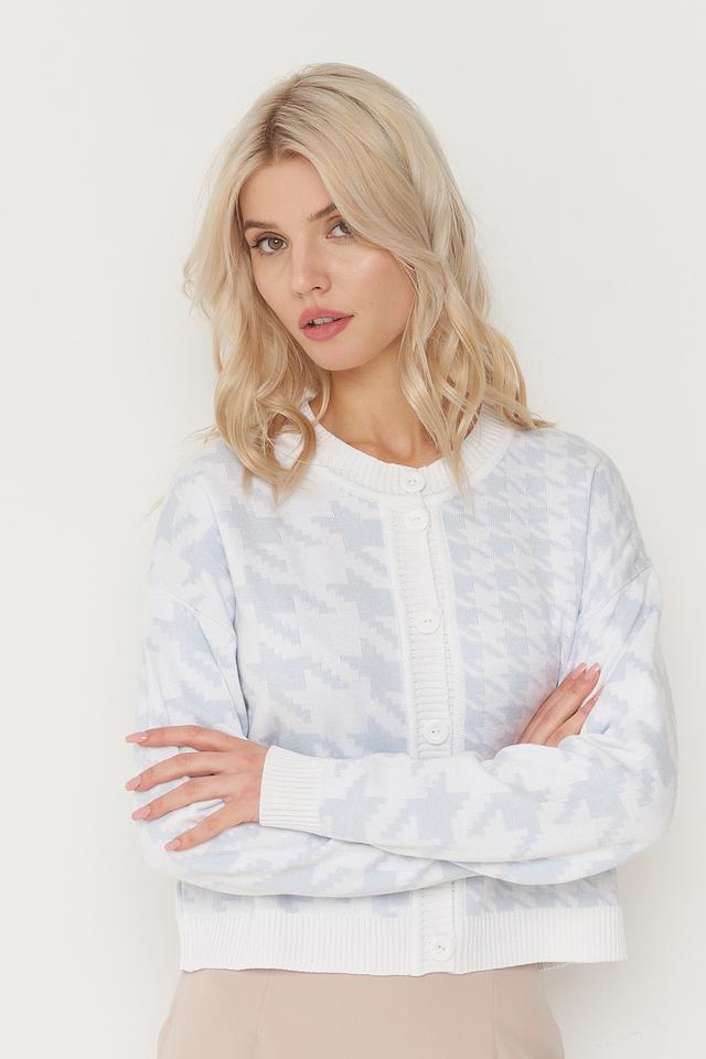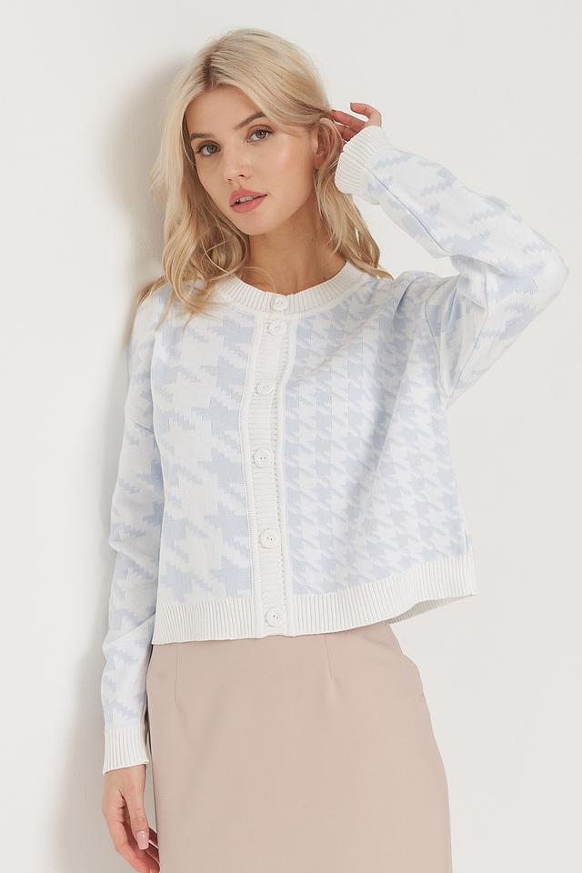 Стильный кардиган BE YOU голубого цвета с узором «гусиная лапка» станет отличным дополнением к вашему гардеробу. Изготовлен из мягкого хлопка с добавлением пан для комфорта и удобства. Застежка на пуговицы. Состав: хлопок 50%, пан 50%