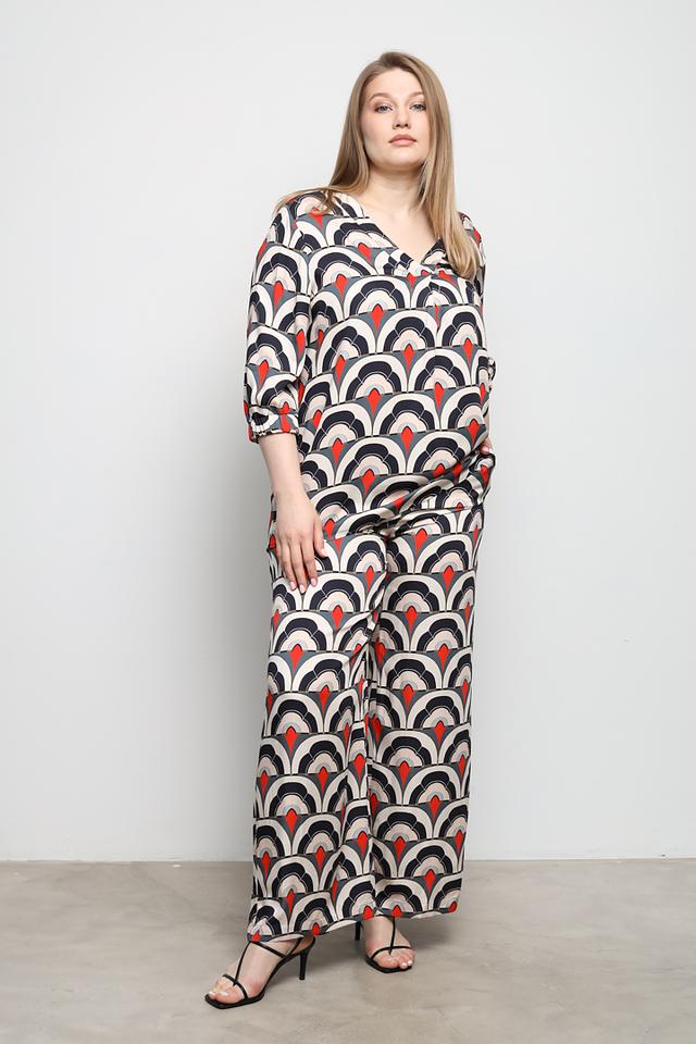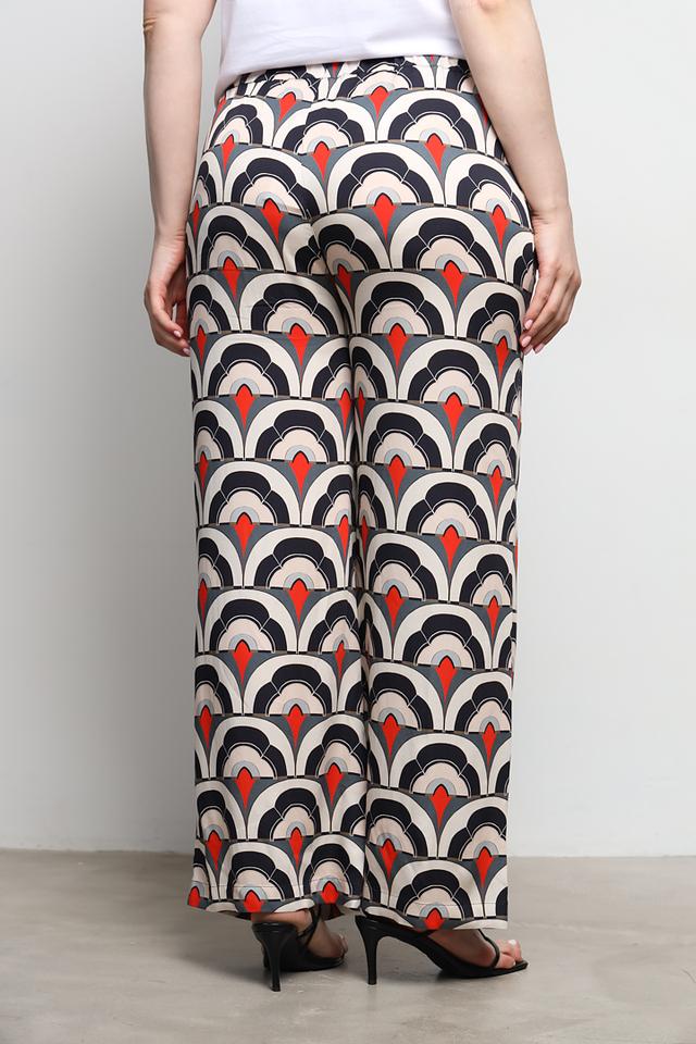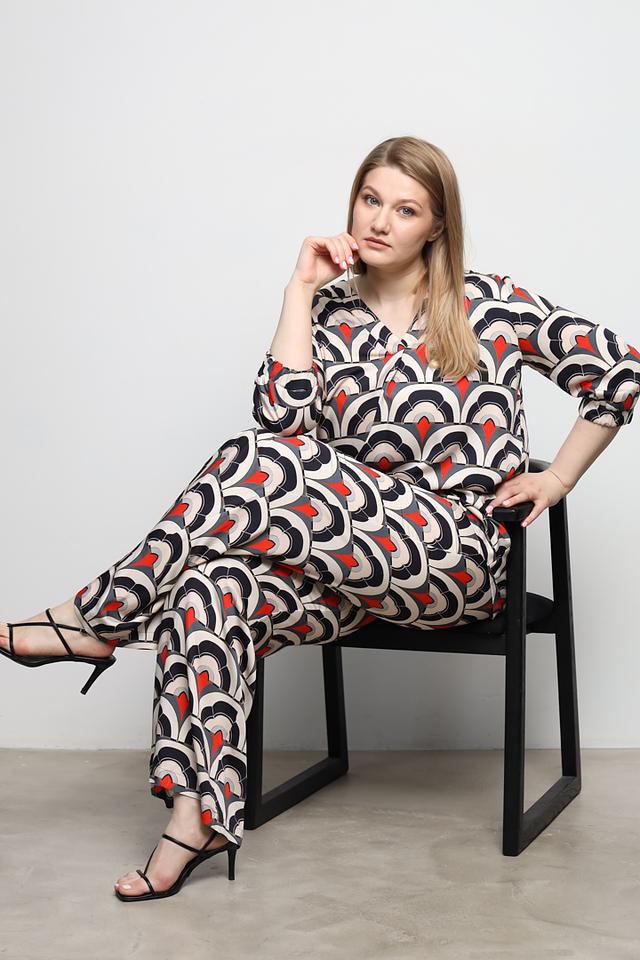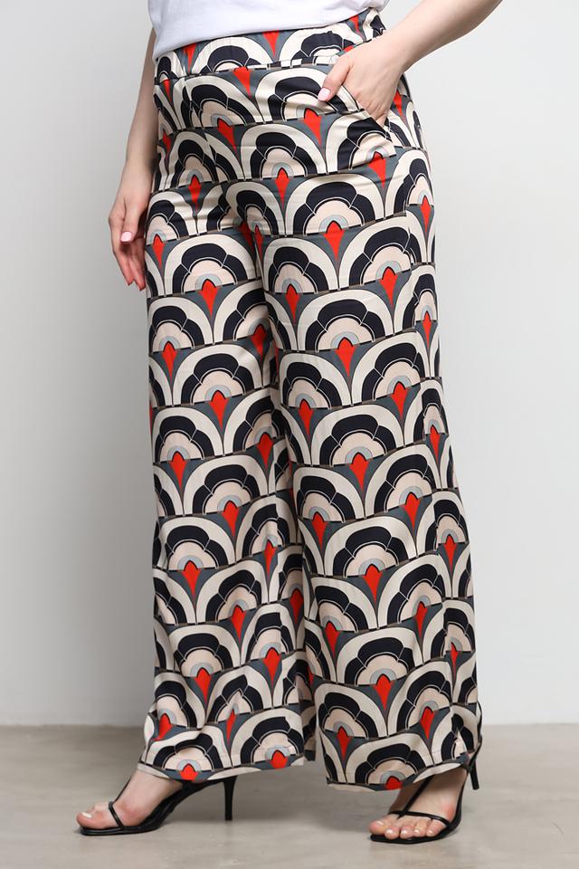 Брюки имеют широкий крой и высокую посадку, что обеспечивает свободу движений и подчеркивает талию. Оригинальный принт в чёрно-красно-белой гамме делает эти брюки по-настоящему уникальными и привлекательными.