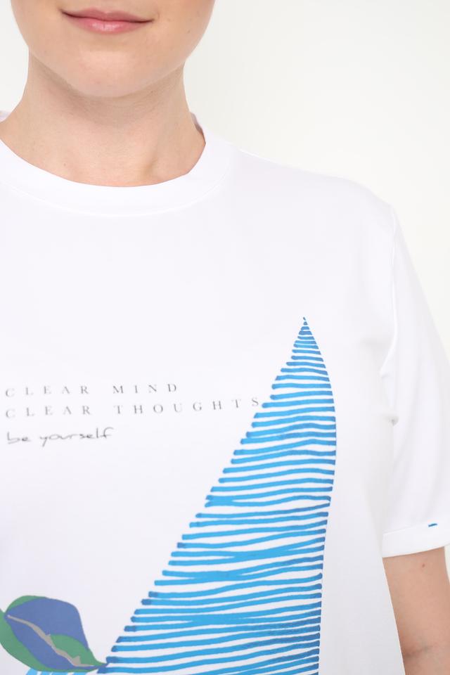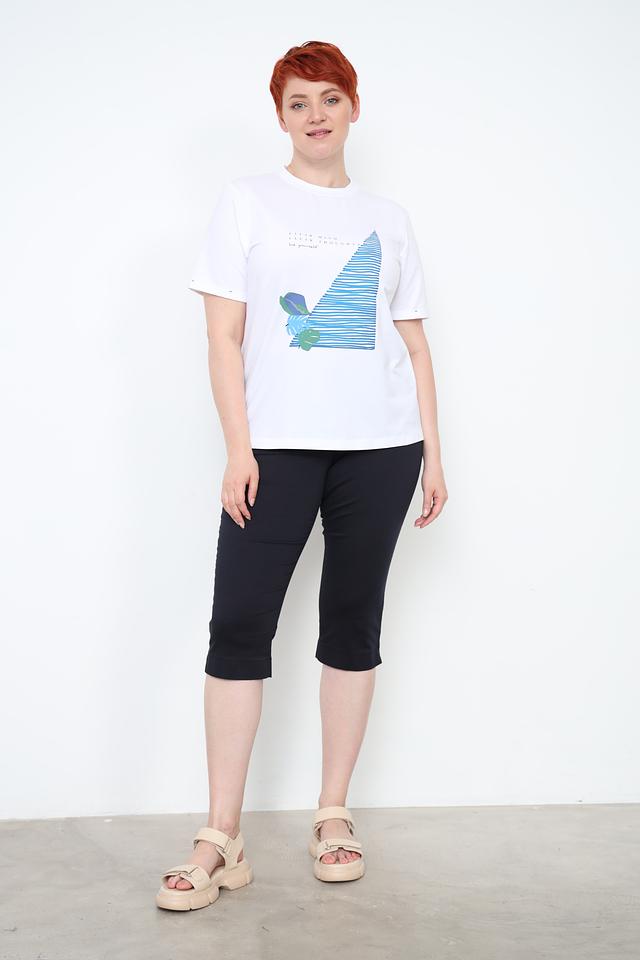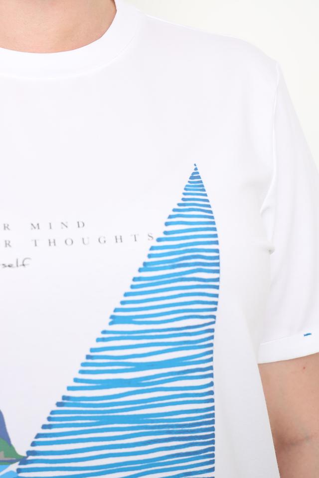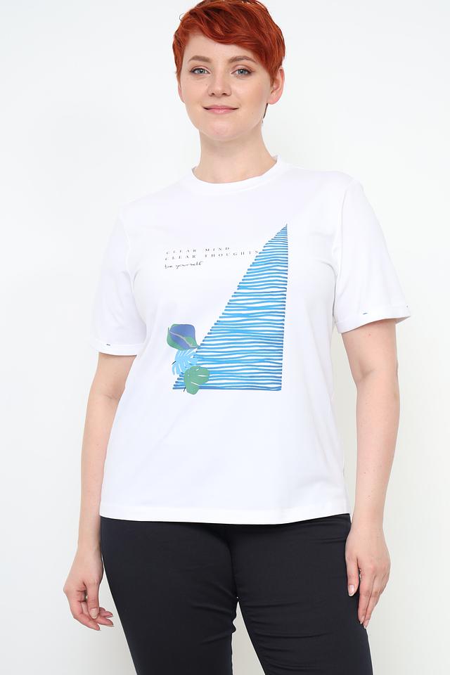 Белая футболка Be Yourself с оригинальным принтом в виде абстрактного пейзажа. Изготовлена из мягкого и приятного к телу сочетания хлопка, модала и эластана, обеспечивающего комфорт при носке. Состав: хлопок 47%, модал 46%, эластан 7%