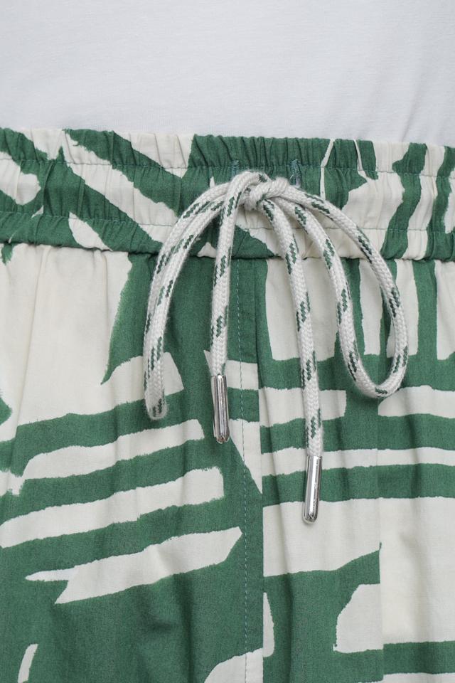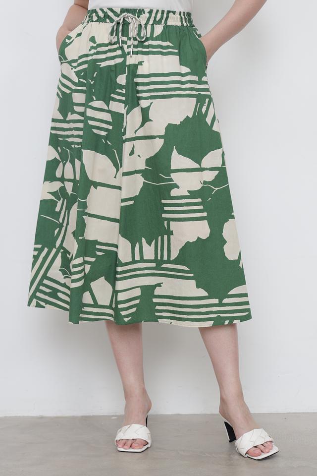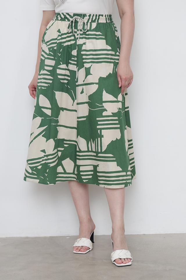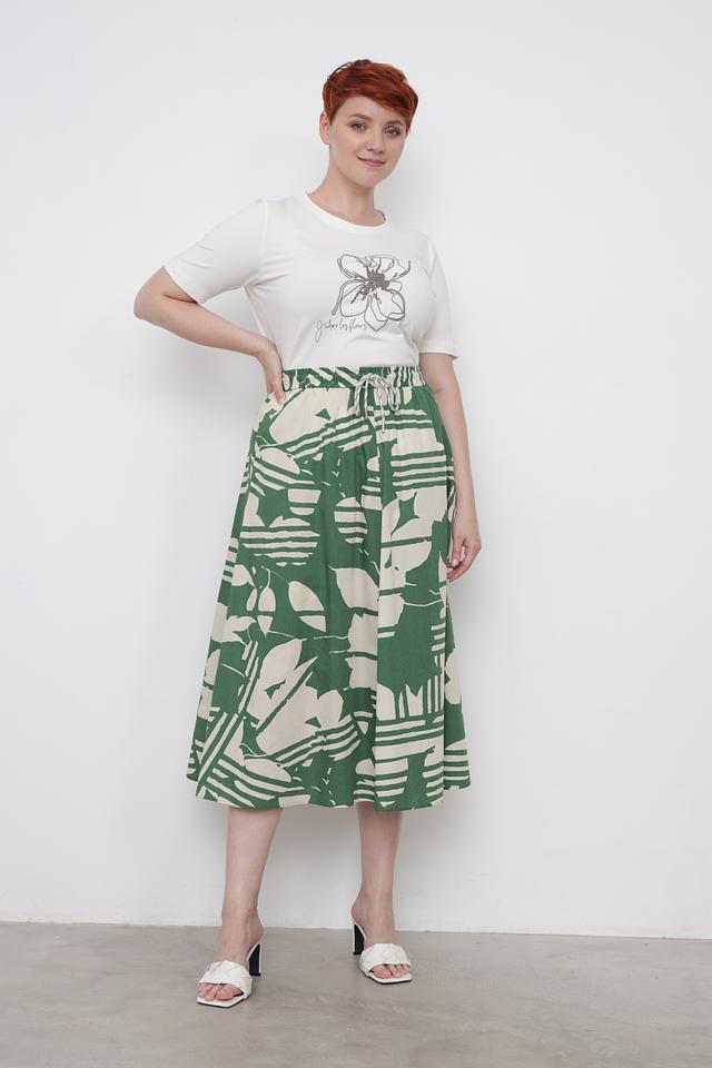 Юбка имеет длину миди и свободный крой, который не сковывает движений. Эластичный пояс с кулиской обеспечивает надежную посадку по фигуре. Главная особенность этой модели – яркий и оригинальный принт с изображением листьев и цветов в зеленых и бежевых тонах.