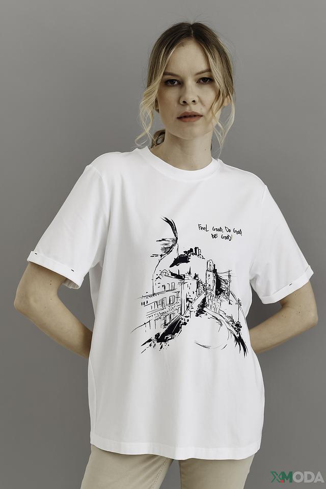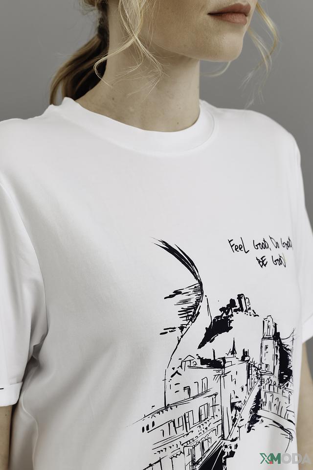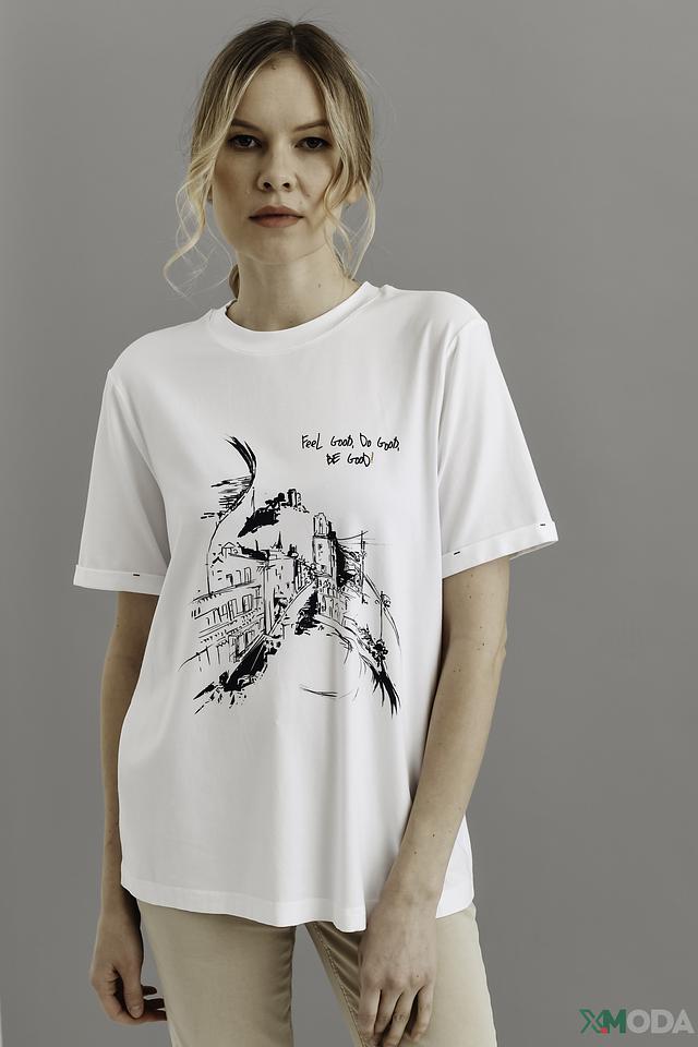 Эта стильная футболка от Be Yourself станет отличным дополнением к вашему гардеробу. Выполнена в белом цвете и украшена эффектным принтом с изображением городских пейзажей и птиц.