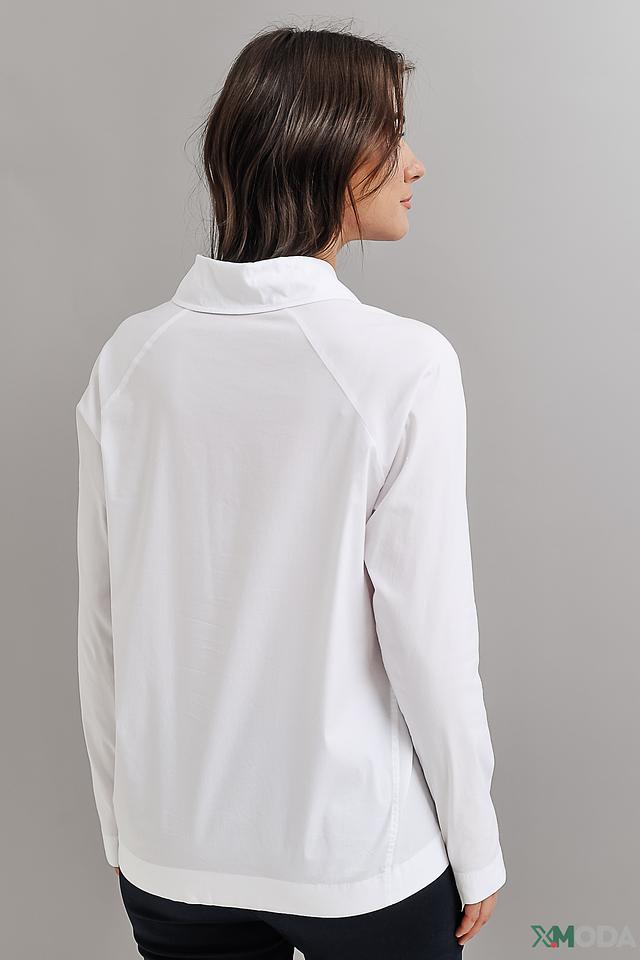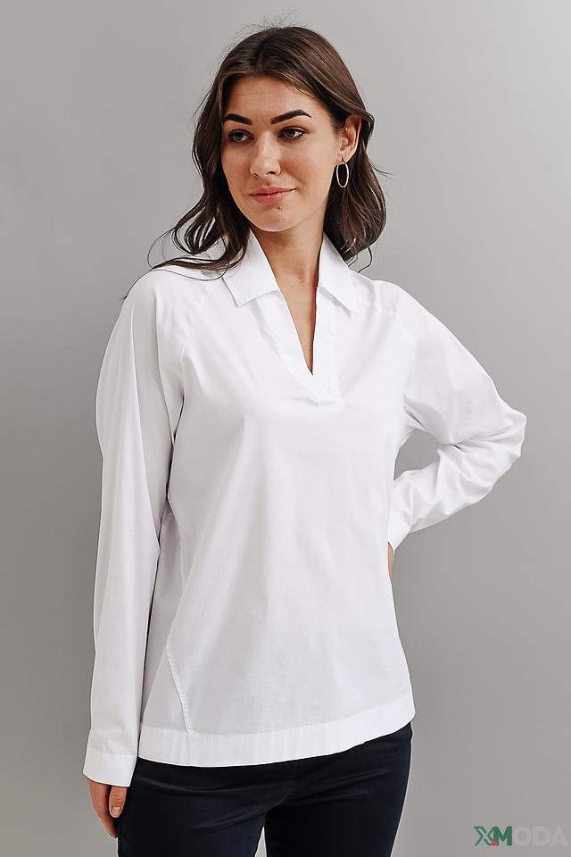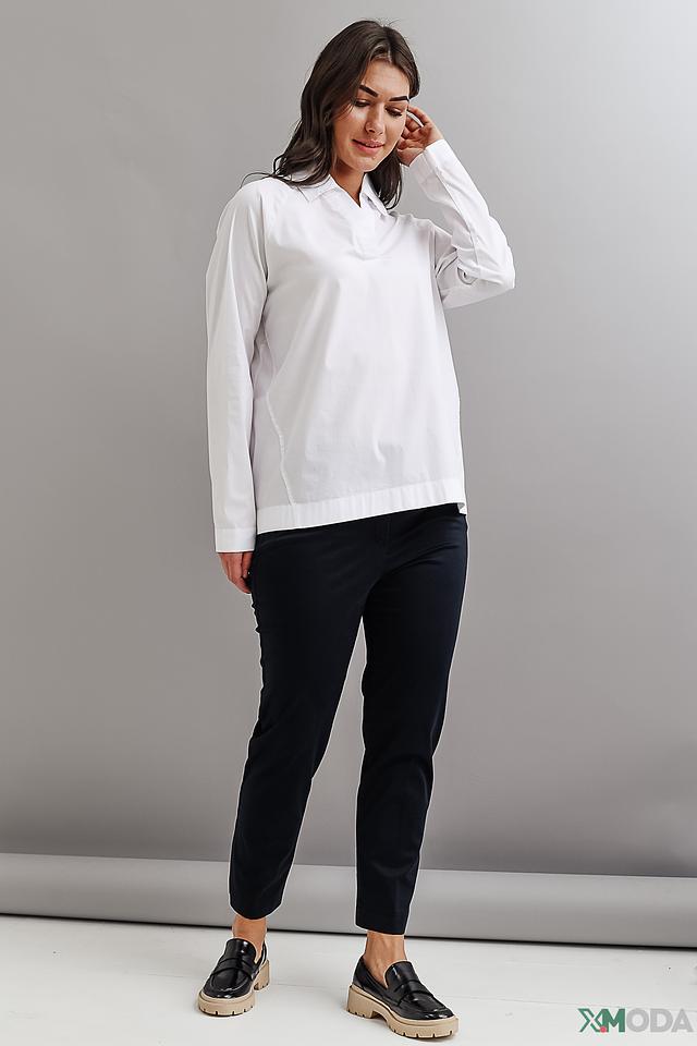 Блуза имеет прямой крой, длинные рукава и воротник, который плавно переходит в V-образный вырез. Материал – сочетание хлопка, полиамида и эластана, что обеспечивает приятные тактильные ощущения, хорошую посадку по фигуре и лёгкость в уходе.