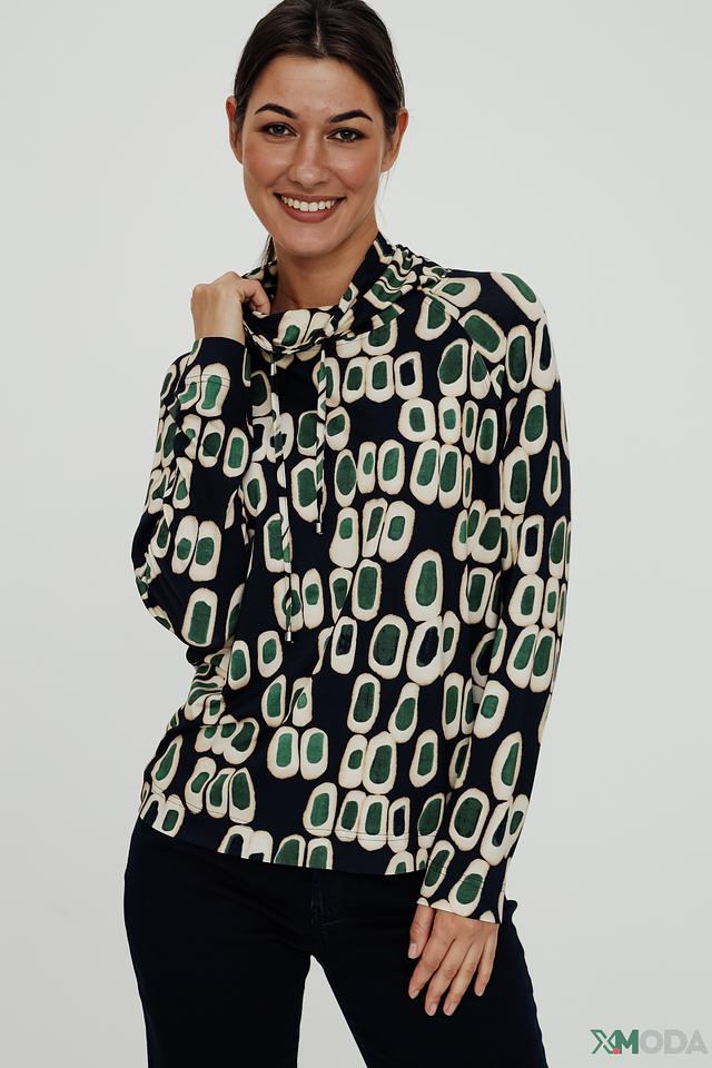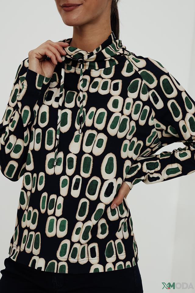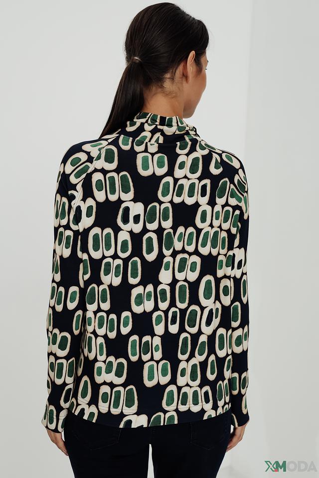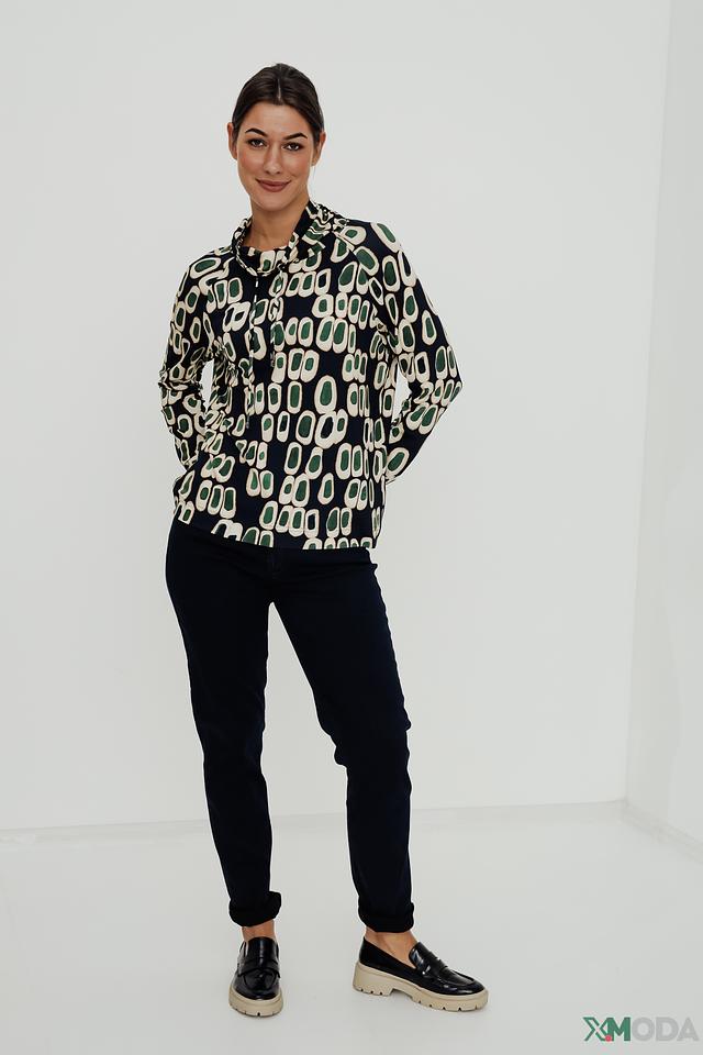 Блуза имеет оригинальный принт, сочетающий в себе оттенки зеленого, бежевого и черного. Выразительный рисунок придает образу динамичность и индивидуальность.