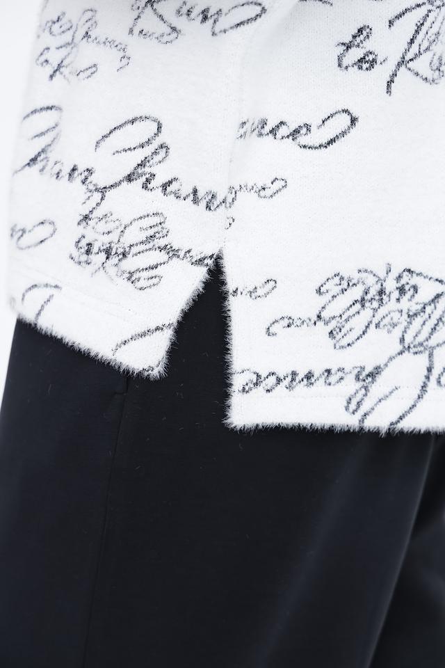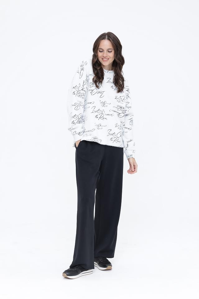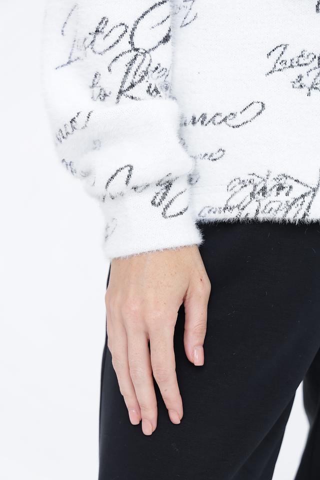 Белый пуловер от Beatris с оригинальным принтом в виде надписей. Модель выполнена из мягкого и приятного к телу сочетания полиэстера, вискозы и эластана, обеспечивающего комфорт при носке. Состав: полиэстер 65%, вискоза 34%, эластан 3%