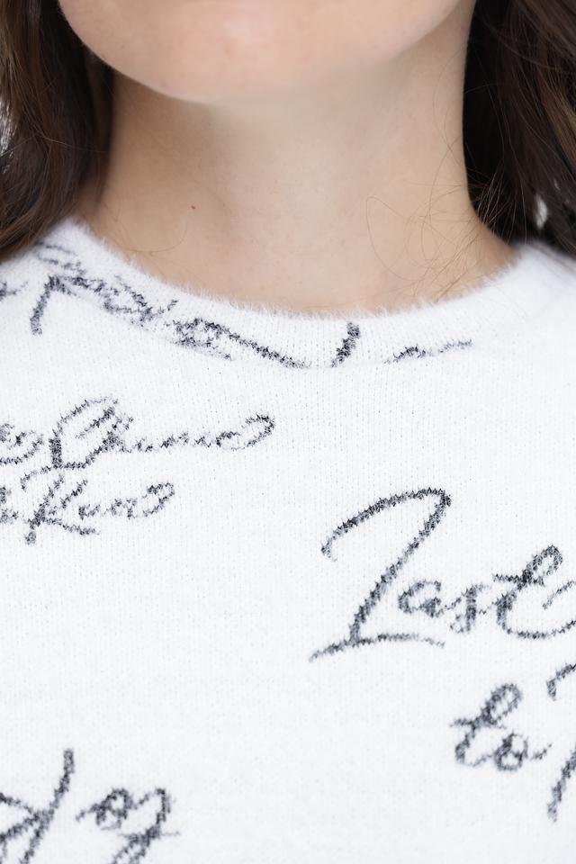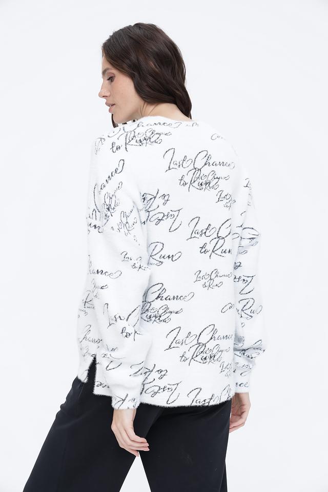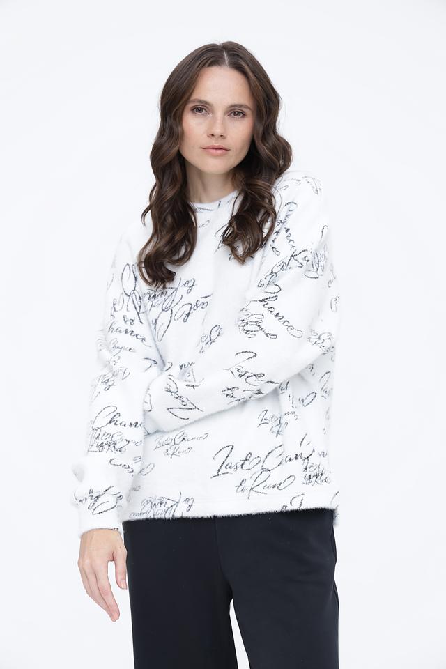 Этот стильный пуловер от Beatris станет отличным дополнением к вашему гардеробу. Он выполнен в белом цвете и украшен эффектным принтом с надписями, что придает ему индивидуальность.