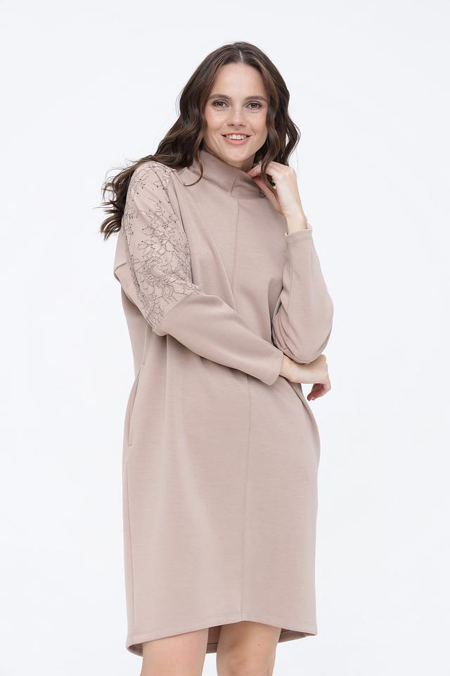 Платье имеет прямой, слегка зауженный к низу силуэт, который визуально стройнит фигуру. Высокий воротник-стойка добавляет элегантности, а длинные рукава с декоративными вставками из кружева придают платью изысканность. Кружево выполнено в тон основной ткани, создавая гармоничный образ.