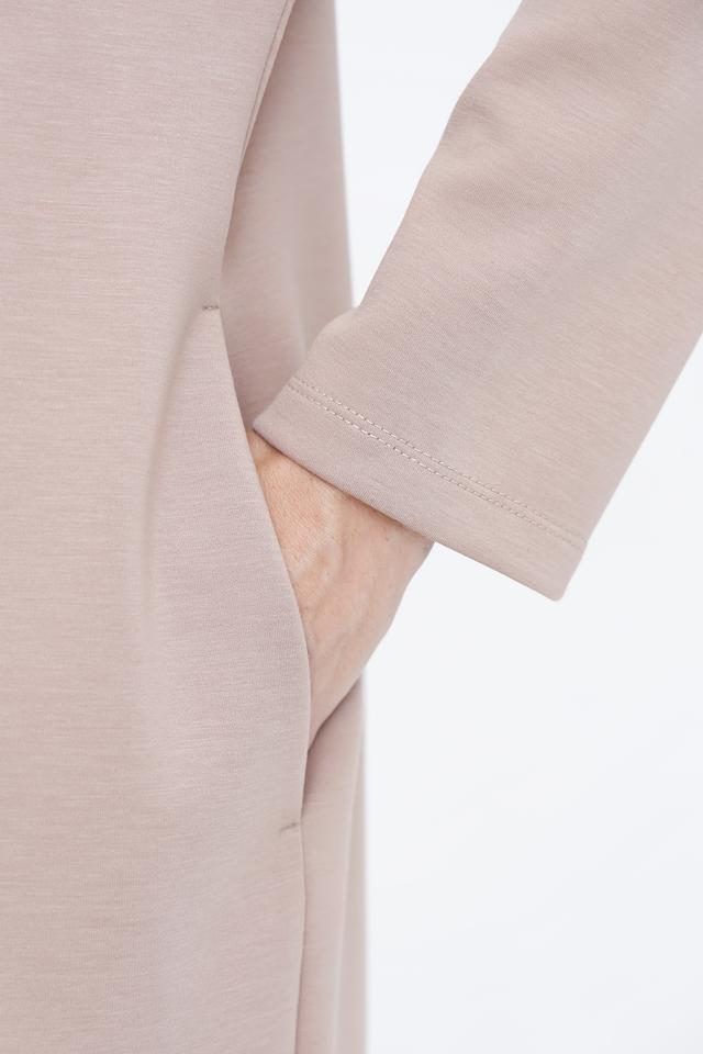 Платье оснащено удобными боковыми карманами. Универсальный бежевый цвет платья легко сочетается с различными аксессуарами и обувью, позволяя создавать разнообразные образы. Это отличный выбор для работы, прогулок или особых случаев.