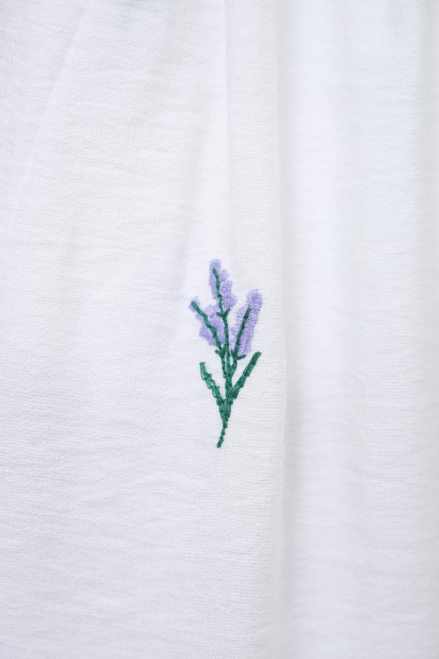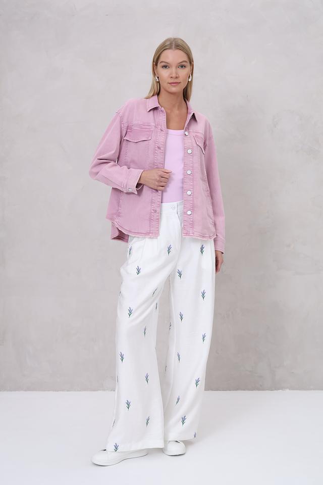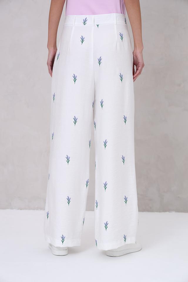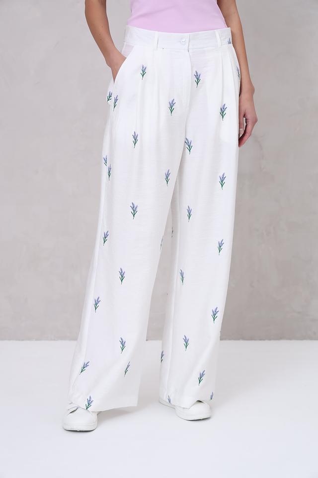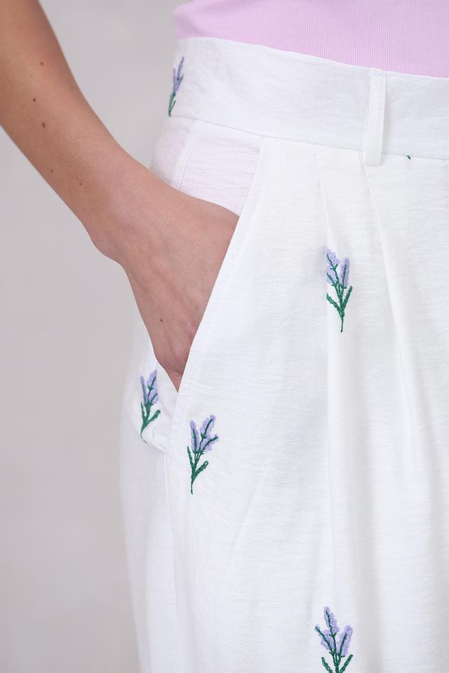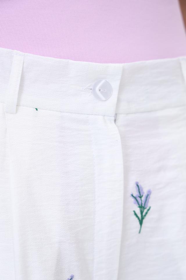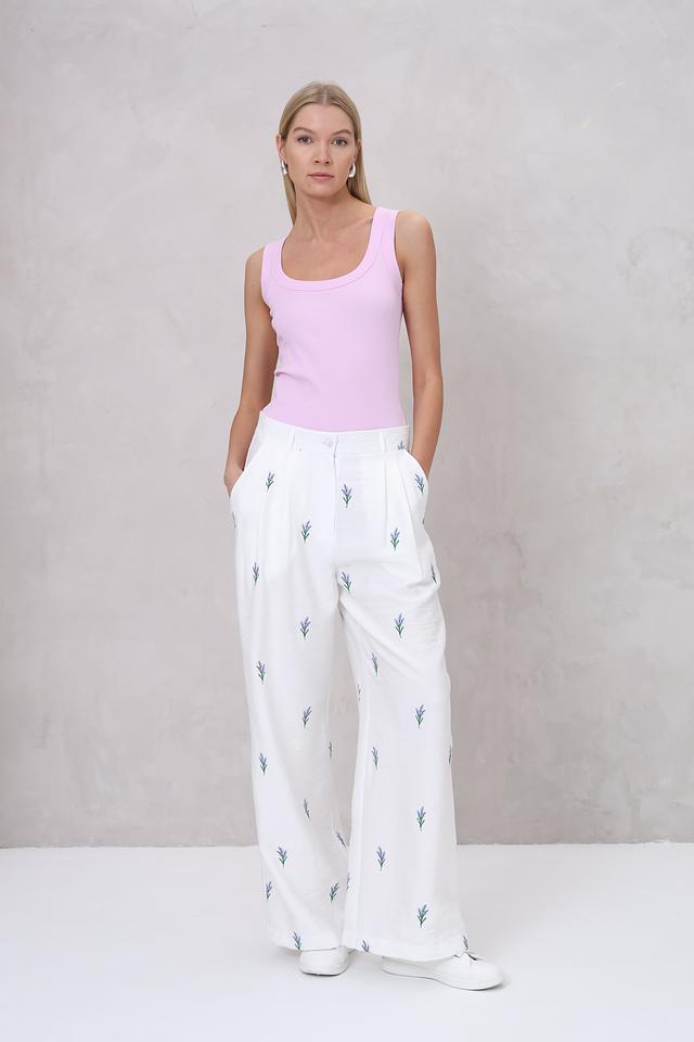 Брюки отличаются свободным кроем и высокой посадкой, что обеспечивает комфорт и свободу движений. По всей поверхности брюк расположена изысканная вышивка в виде небольших веточек, придающая изделию особый шарм и индивидуальность.