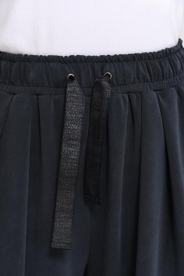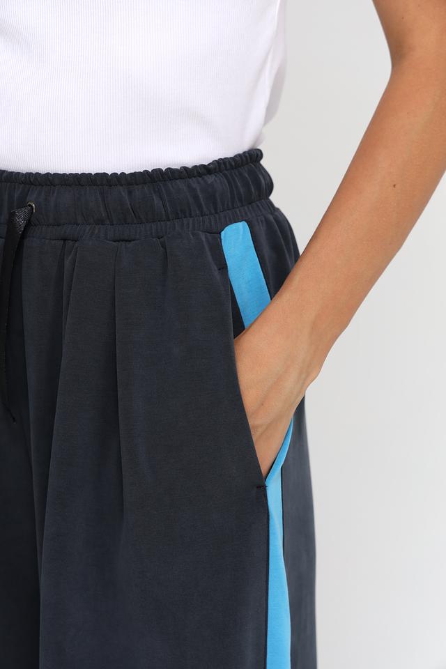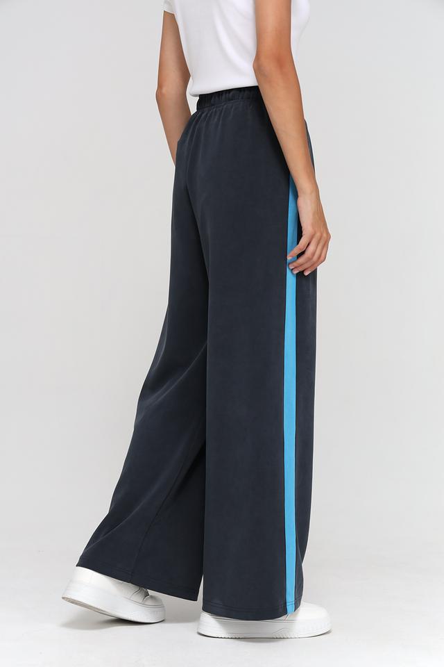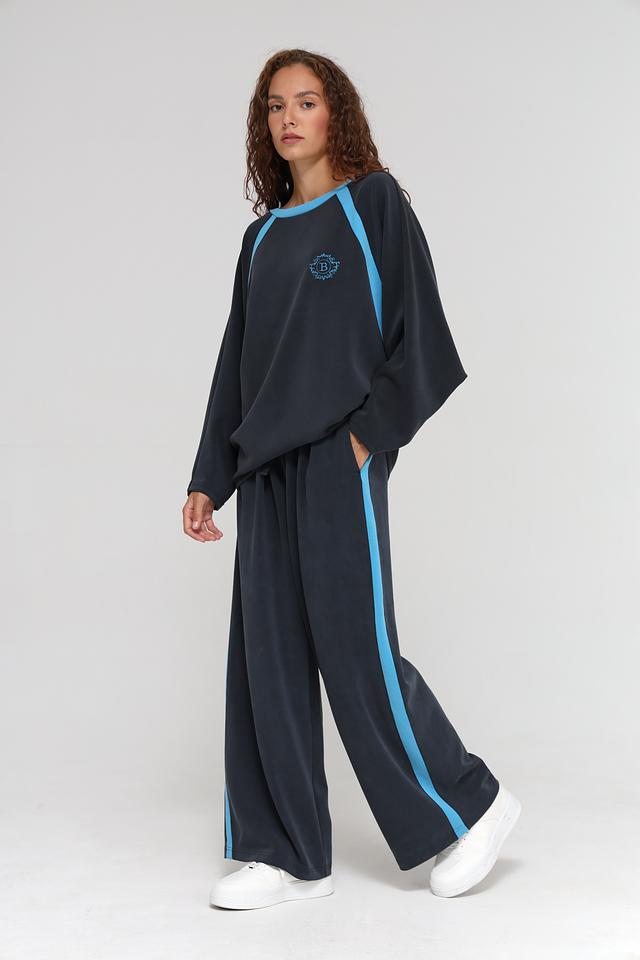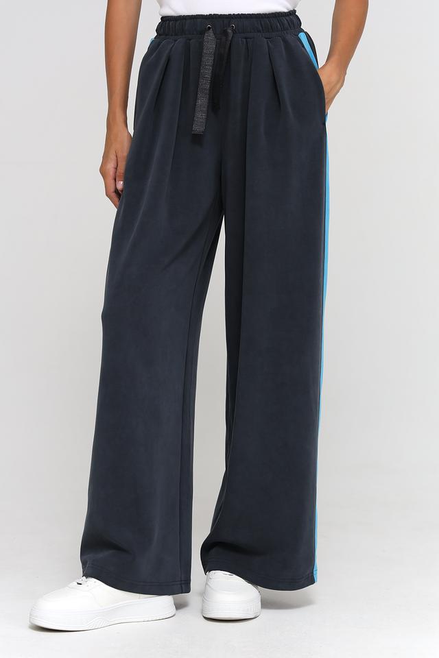 Брюки имеют широкий крой и завышенную талию, что обеспечивает свободу движений и подчеркивает достоинства фигуры. Эластичный пояс дополнен шнурком для регулировки посадки. Боковые полосы яркого голубого цвета придают брюкам спортивный шик и делают образ более динамичным.