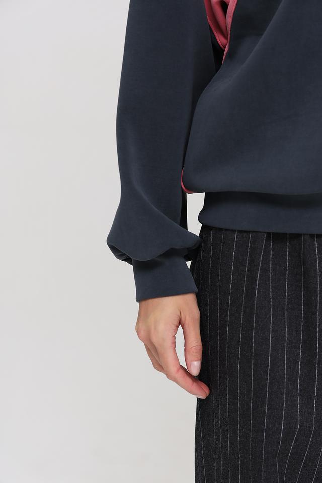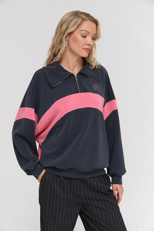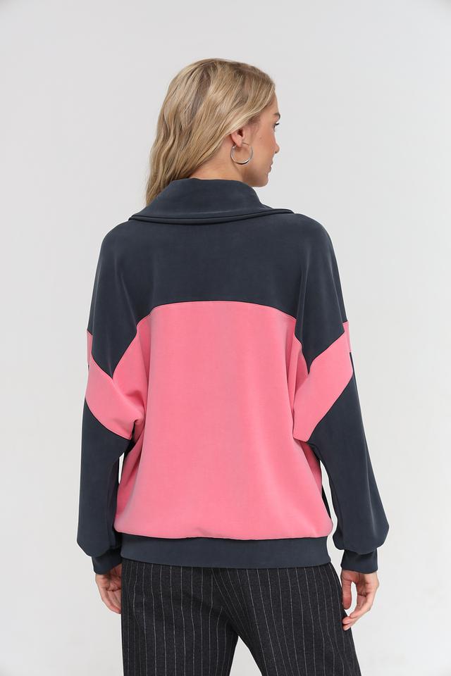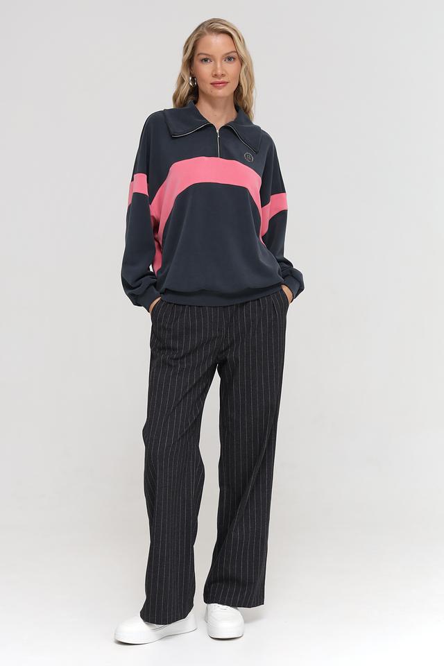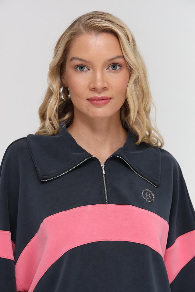 Дизайн пуловера выполнен в сочетании темно-синего и розового цветов, с широкими горизонтальными полосами, которые добавляют образу динамичности. Короткий разрез на молнии в области горловины придает модели современный вид и позволяет регулировать степень открытости.