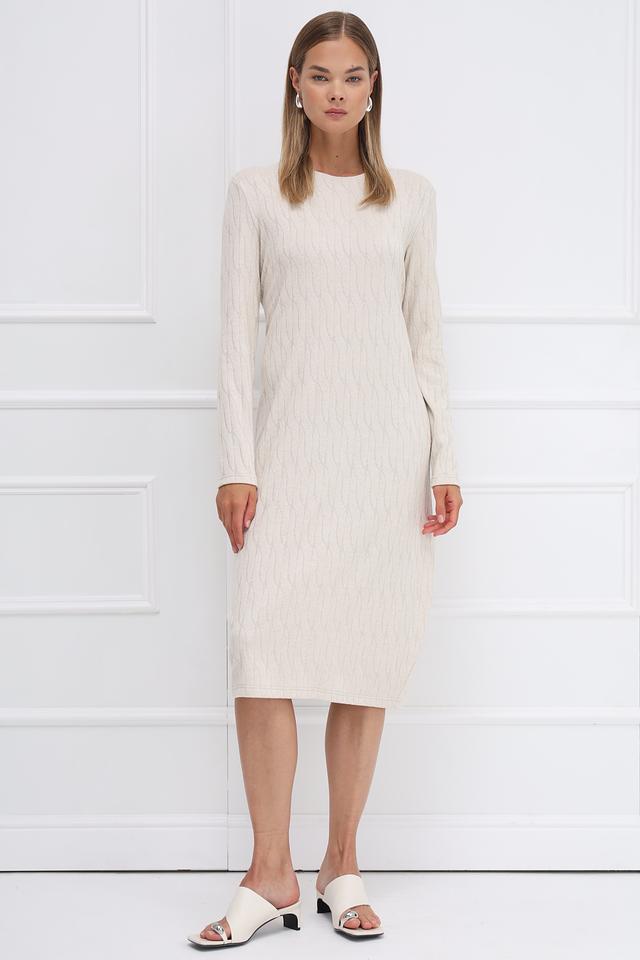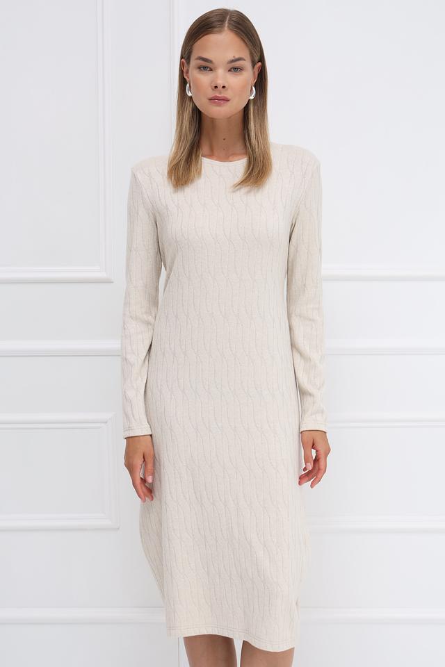 Платье имеет приталенный силуэт, который подчеркивает фигуру, и длинные рукава, делая его подходящим для прохладной погоды. Рельефный узор в виде кос придает изделию изысканность и текстуру.