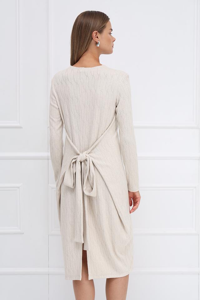Бежевое платье от Beatris выполнено из мягкого вязаного полотна с рельефным узором. Модель имеет длинные рукава и приталенный силуэт, а пояс с завязками на спине подчеркивает талию. Состав: вискоза 50%, полиэстер 25%, нейлон 22%, спандекс 3%