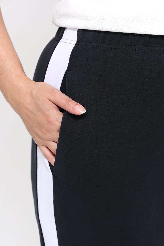 Брюки имеют прямой крой, который обеспечивает свободу движений и подходит для различных типов фигуры. Эластичный пояс гарантирует удобную посадку и не сковывает движения. Боковые полоски белого цвета добавляют динамики и делают брюки более интересными.