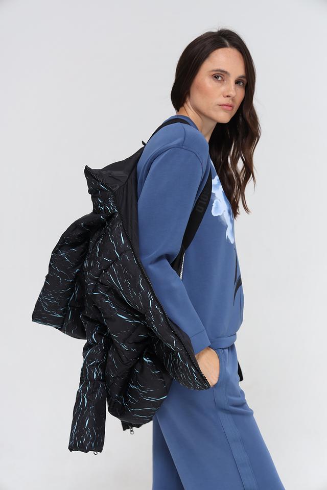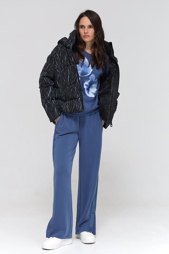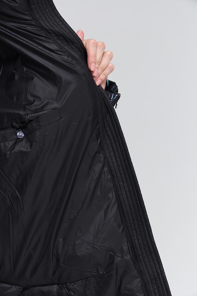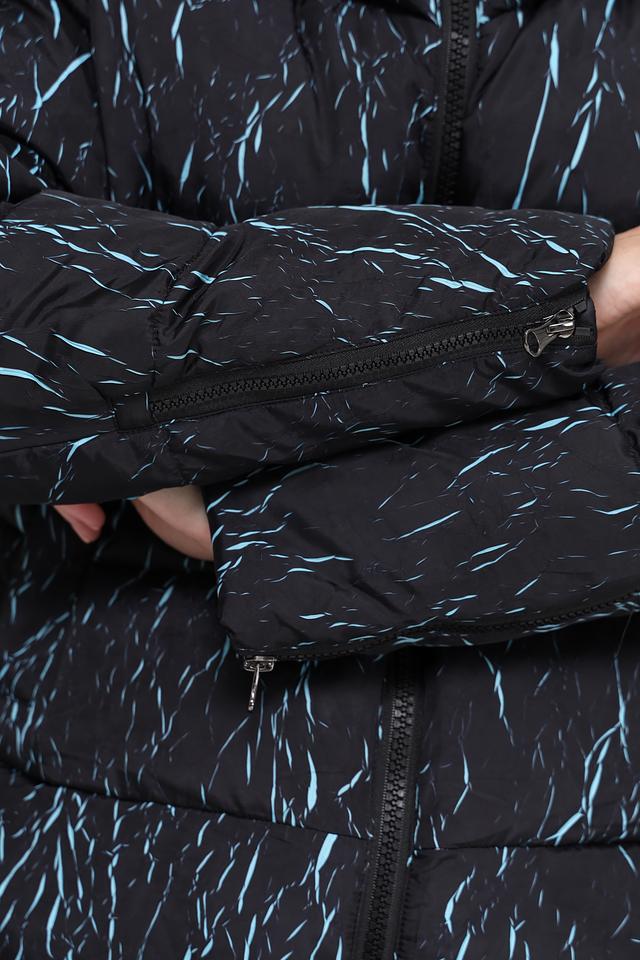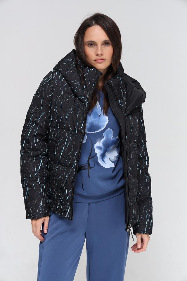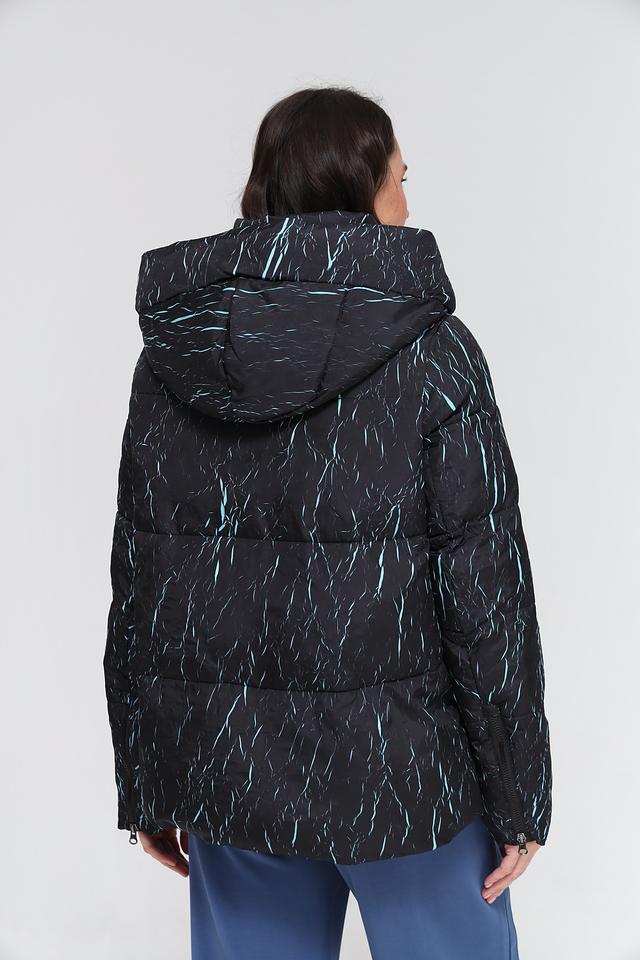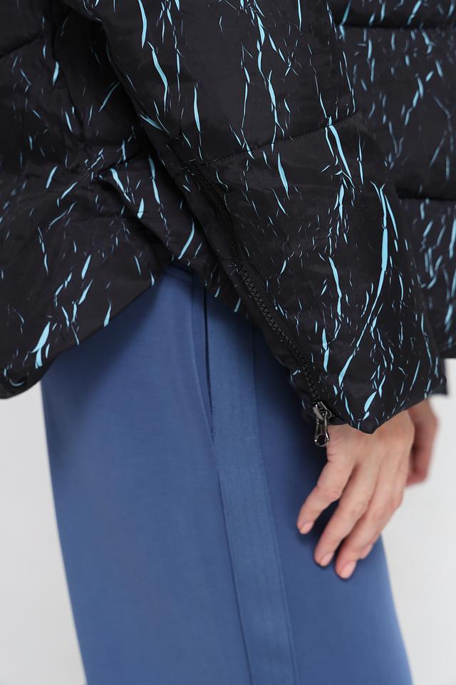 Куртка имеет степповую текстуру и оригинальный принт в виде абстрактных линий светло-голубого цвета на черном фоне. Модель оснащена удобным капюшоном, который защитит от непогоды. Застежка – молния.