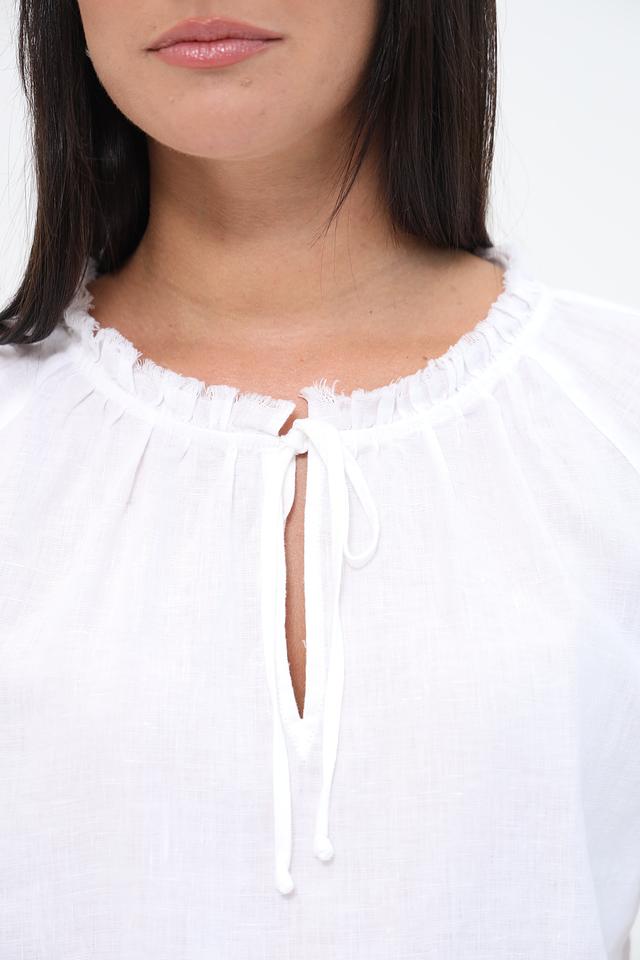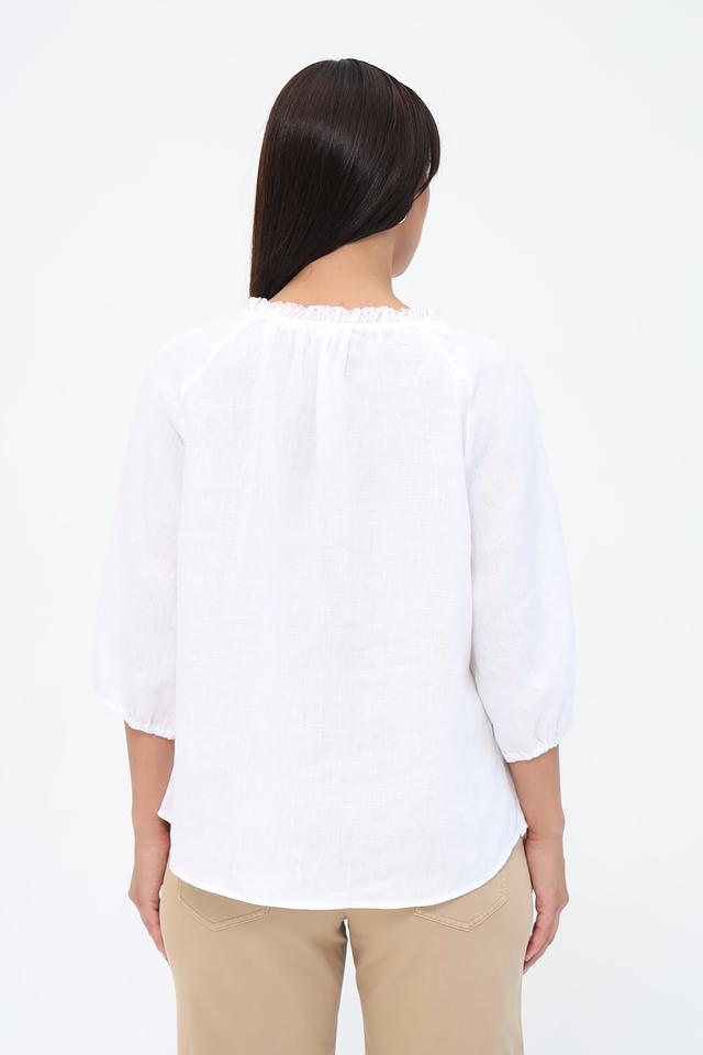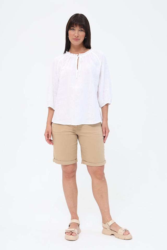 Белая блуза Gerry Weber EDITION из 100% льна – это лёгкость и комфорт в жаркую погоду. Модель с округлым вырезом и рукавами 3/4, дополненная декоративными завязками на горловине, станет отличным дополнением к летнему гардеробу. Состав: лен 100%