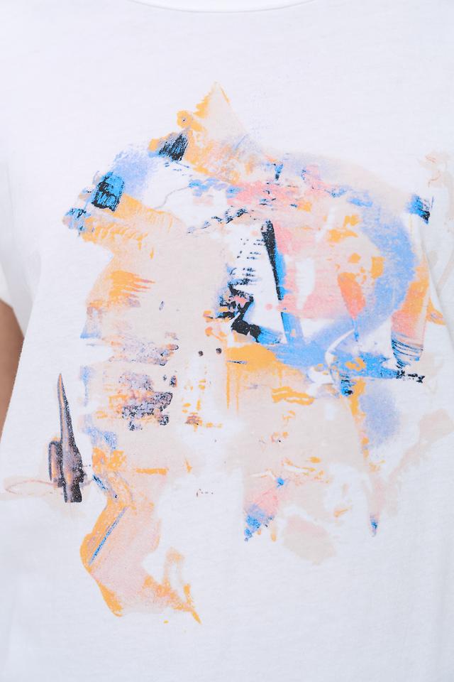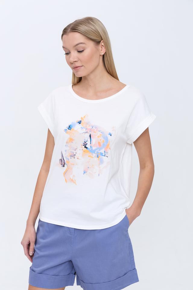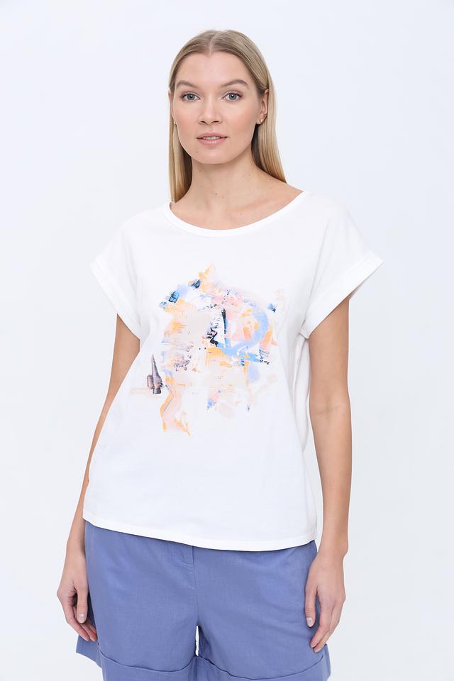 Особенностью данной модели является яркий абстрактный принт на лицевой стороне, который добавляет образу оригинальности и индивидуальности. Футболка имеет свободный крой и короткие рукава с небольшим подворотом, что придает ей непринужденный вид.