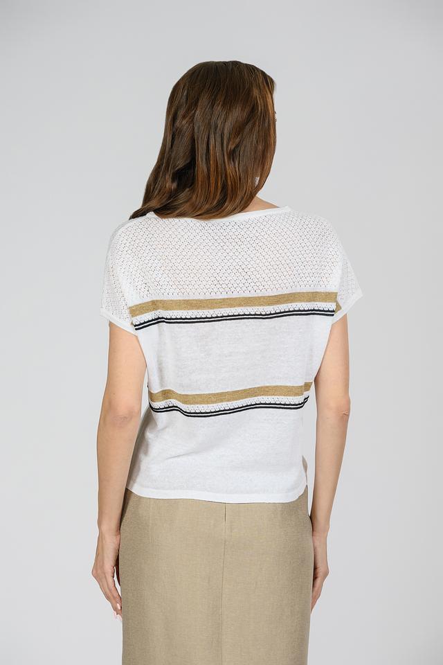 Модель имеет короткий рукав и круглый вырез горловины, а верхняя часть выполнена из ажурного плетения. Джемпер изготовлен из 100% льна, что делает его приятным к телу и обеспечивает комфорт в жаркую погоду.