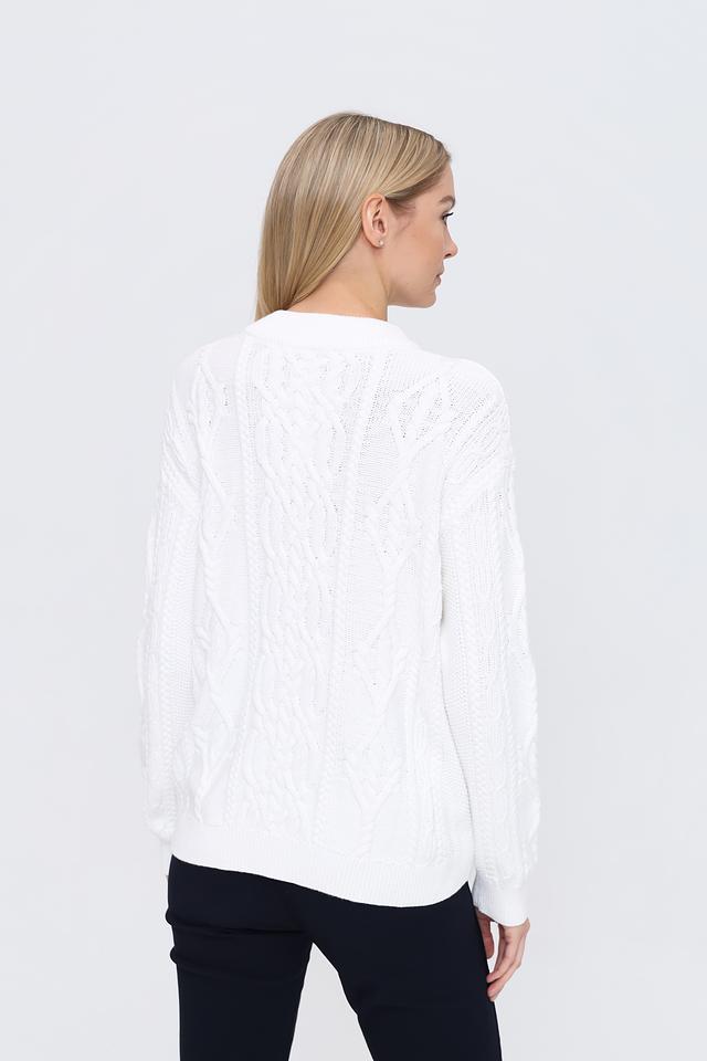 Основной цвет пуловера – белый, что делает его универсальным элементом гардероба, легко сочетаемым с различными вещами. Выразительный узор из кос добавляет изделию текстуру и визуальный интерес.