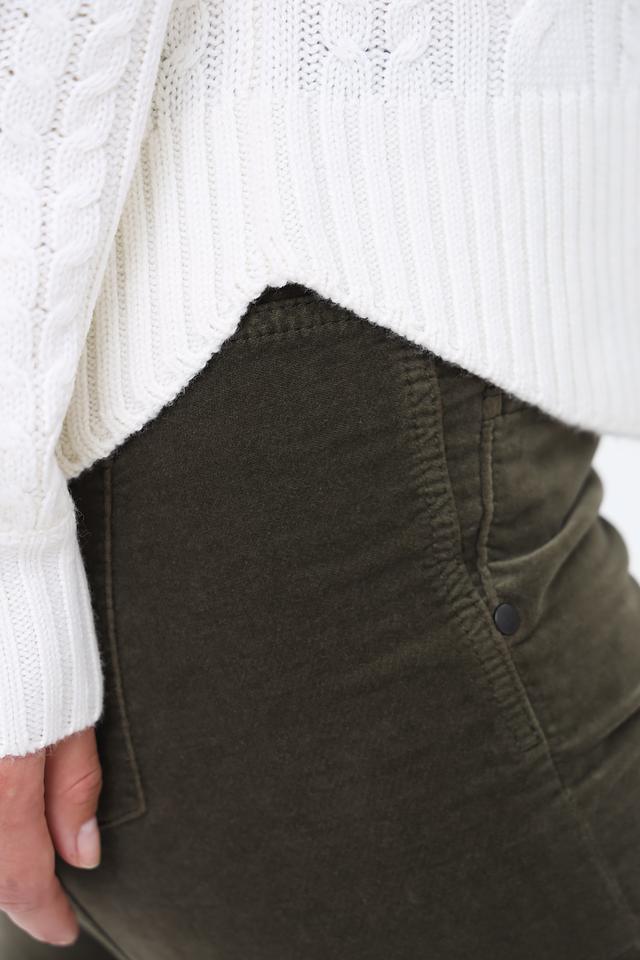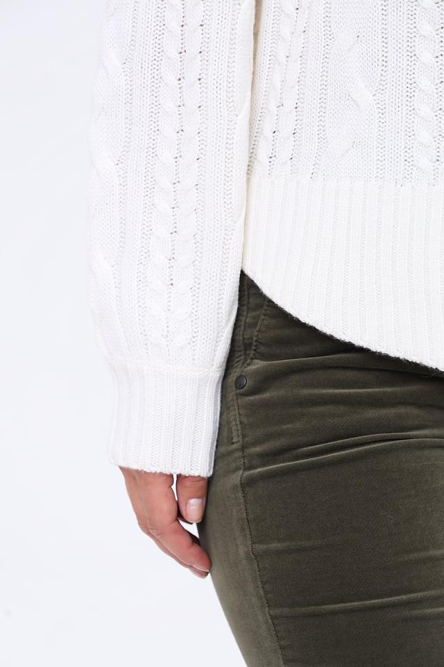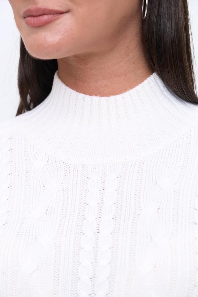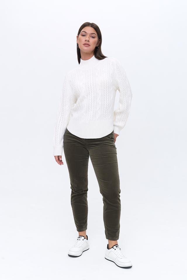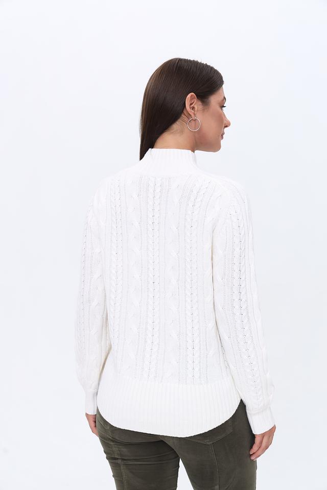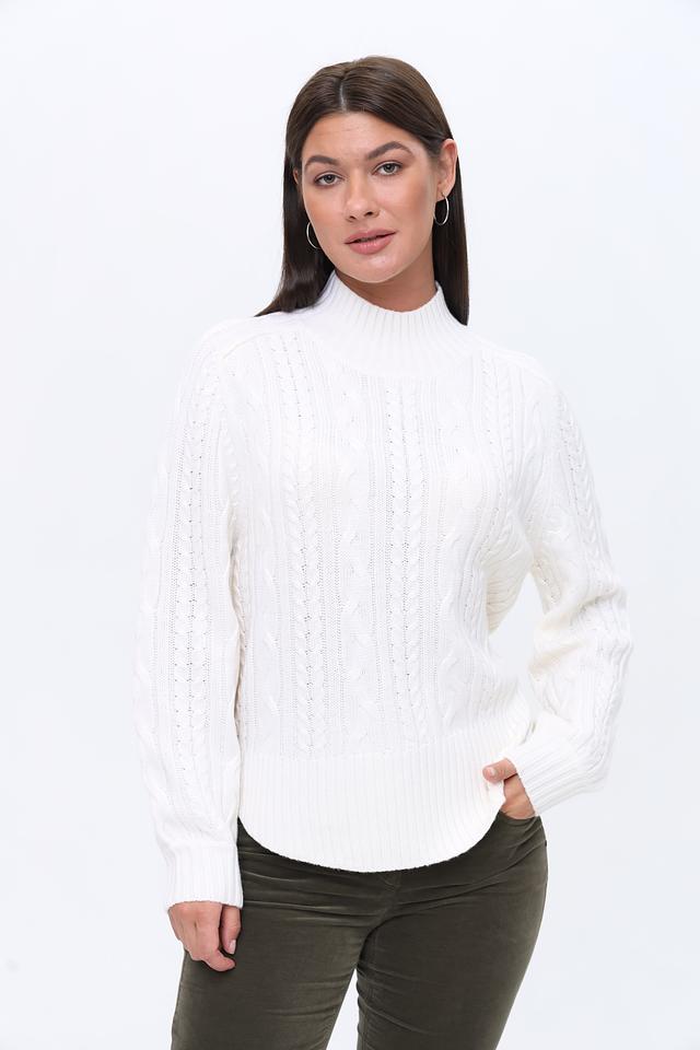 Пуловер имеет молочный цвет и украшен рельефным узором из кос, который придает ему изысканность и оригинальность. Вырез горловины выполнен в форме лодочки, что делает его универсальным и подходящим для различных образов.