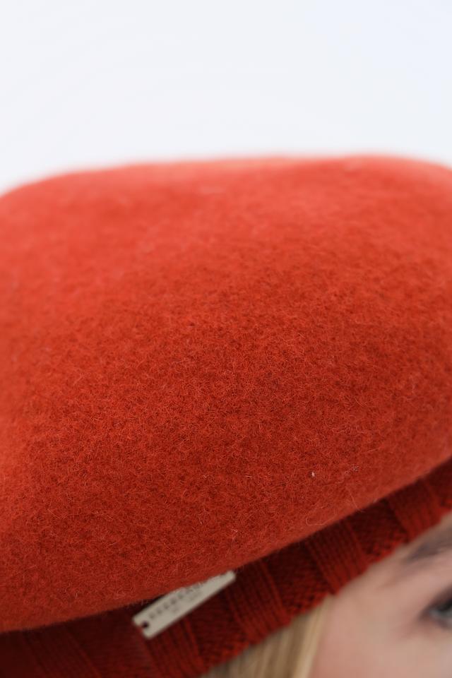 Берет имеет классическую форму и насыщенный рыжий цвет, который легко сочетается с различными стилями одежды. Аккуратный дизайн и высокое качество материалов делают этот аксессуар не только практичным, но и стильным.