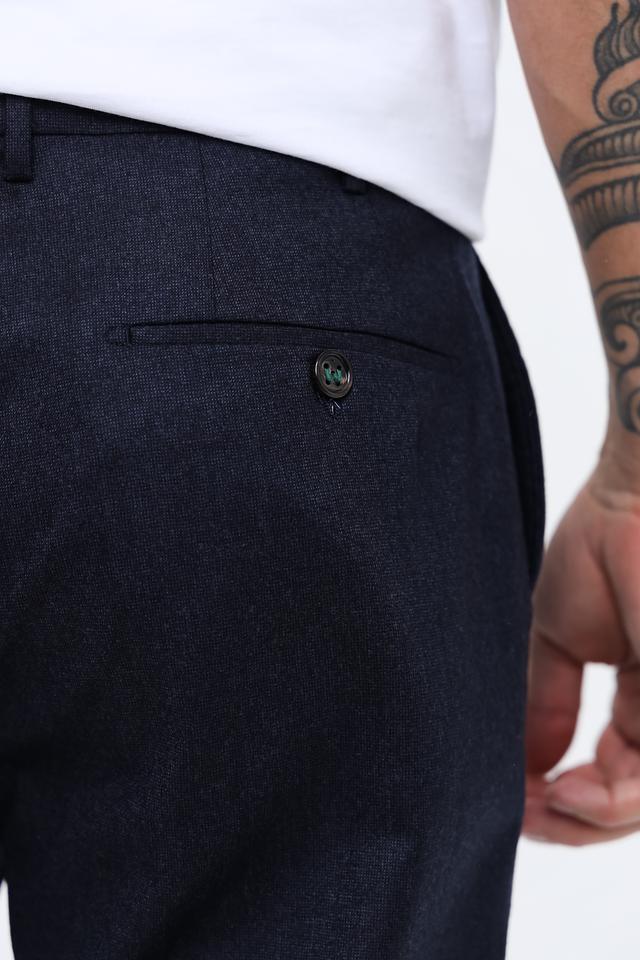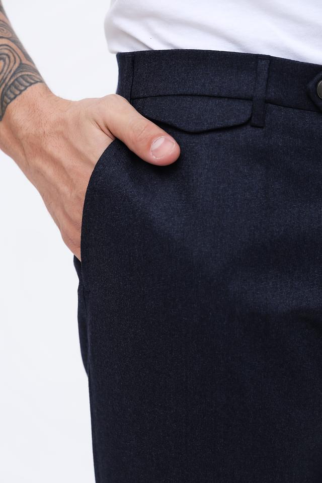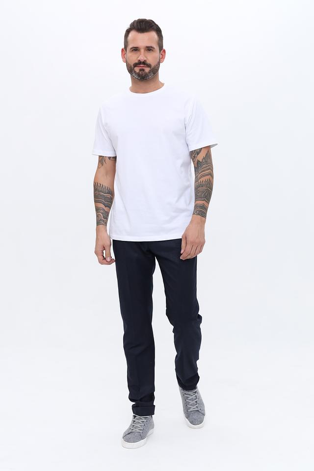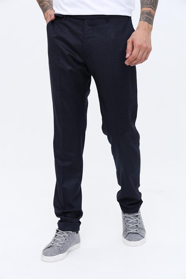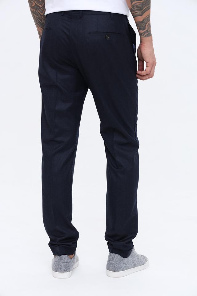 Брюки имеют прямой крой, стандартную посадку и длину, подходящую для подворота. Тёмно-синий цвет делает их универсальными и подходящими для создания различных образов – от делового до повседневного.