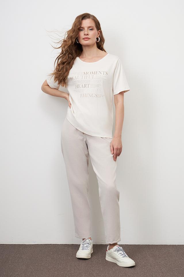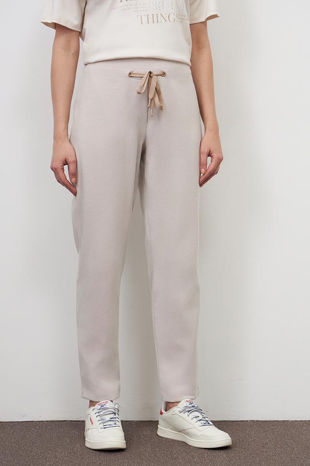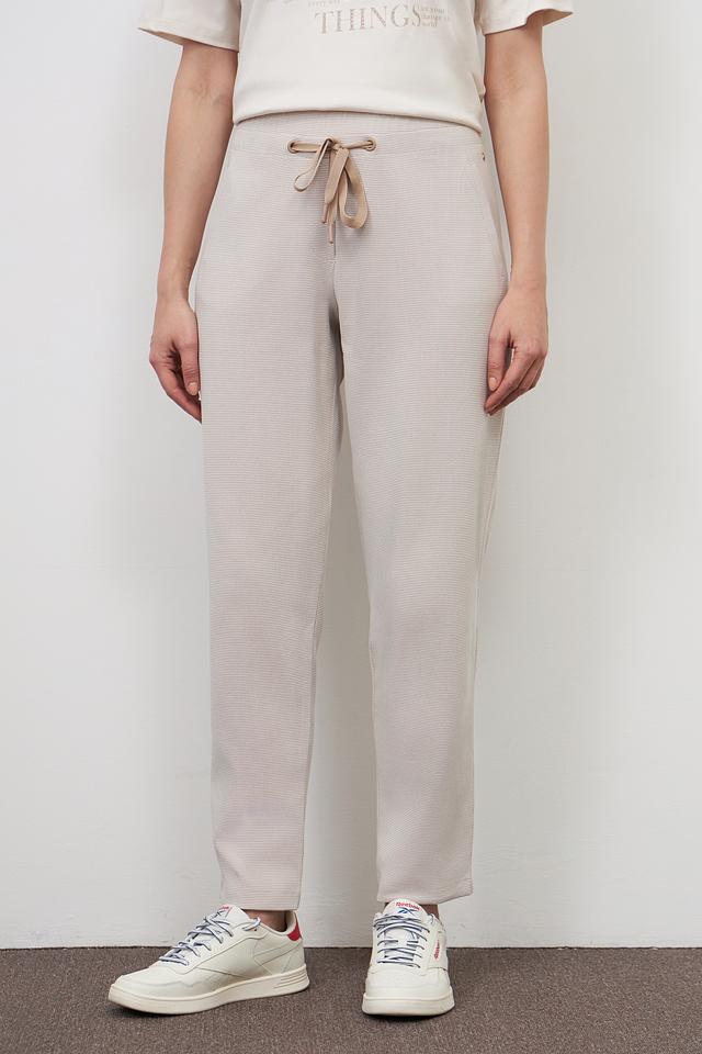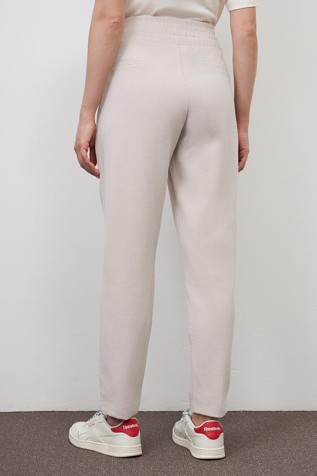 Брюки имеют удобный эластичный пояс с регулирующимися завязками, обеспечивающими идеальную посадку по фигуре. Ткань приятна на ощупь и хорошо тянется, гарантируя комфорт в течение всего дня. Текстурированная поверхность придает брюкам особый шарм.