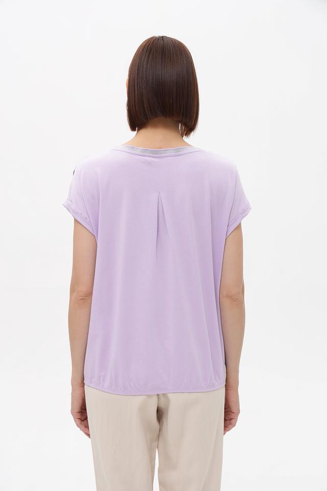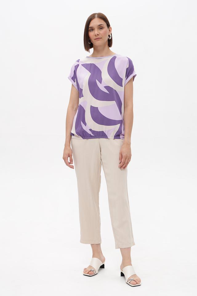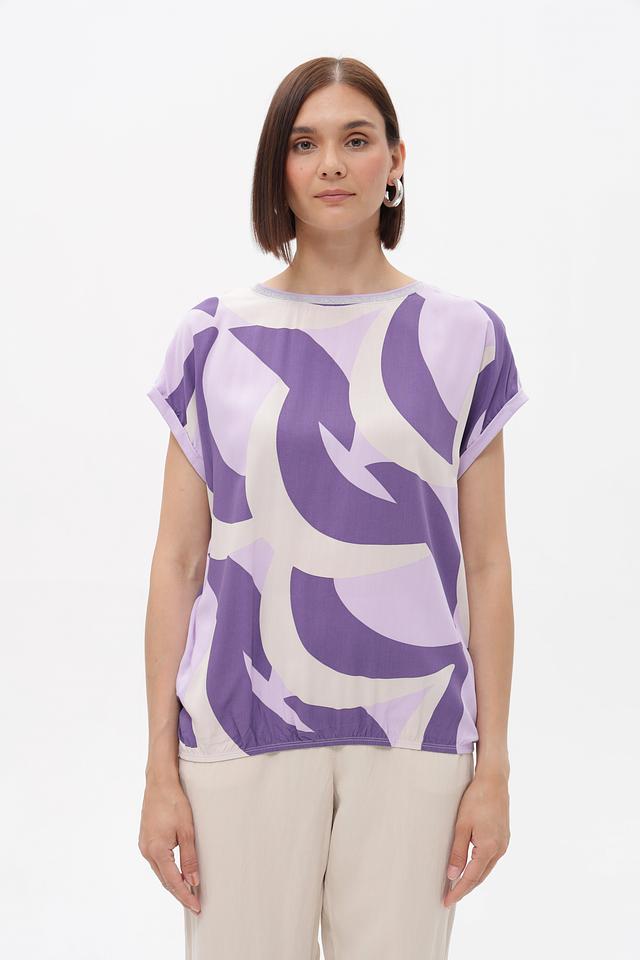 Особенность блузки – стильный абстрактный принт в лавандово-фиолетовой гамме с белыми элементами. Округлый вырез горловины декорирован тонкой светлой полоской. Спинка имеет небольшую сборку, придающую блузке более изящный силуэт.