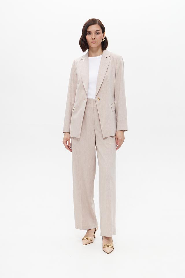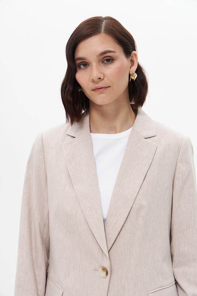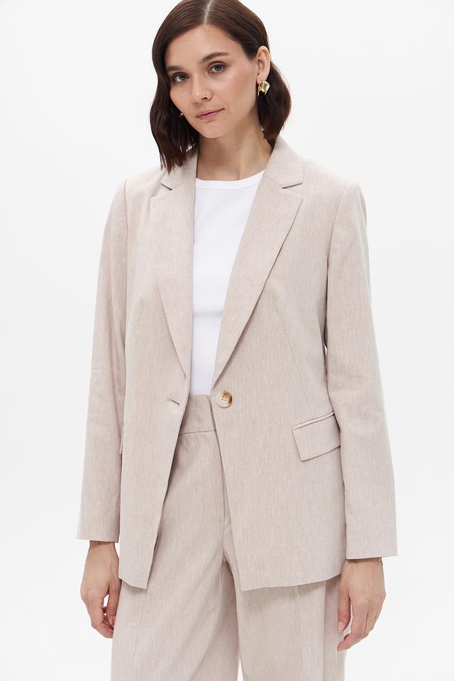 Жакет Betty and Co бежевого цвета – стильная и универсальная модель прямого кроя. Выполнен из смесовой ткани с добавлением льна и хлопка, что обеспечивает комфорт и воздухопроницаемость. Застежка на одну пуговицу. Состав: переработ.полиэстер 31%, лен 28%, хлопок 22%, вискоза 17%, эластан 2%