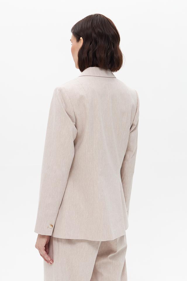 Жакет изготовлен из смесовой ткани, в состав которой входит переработанный полиэстер, лен, хлопок, вискоза и эластан. Такое сочетание материалов обеспечивает комфорт в носке, воздухопроницаемость и небольшую эластичность.