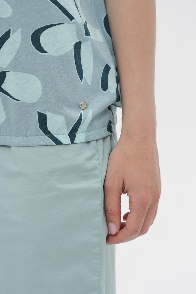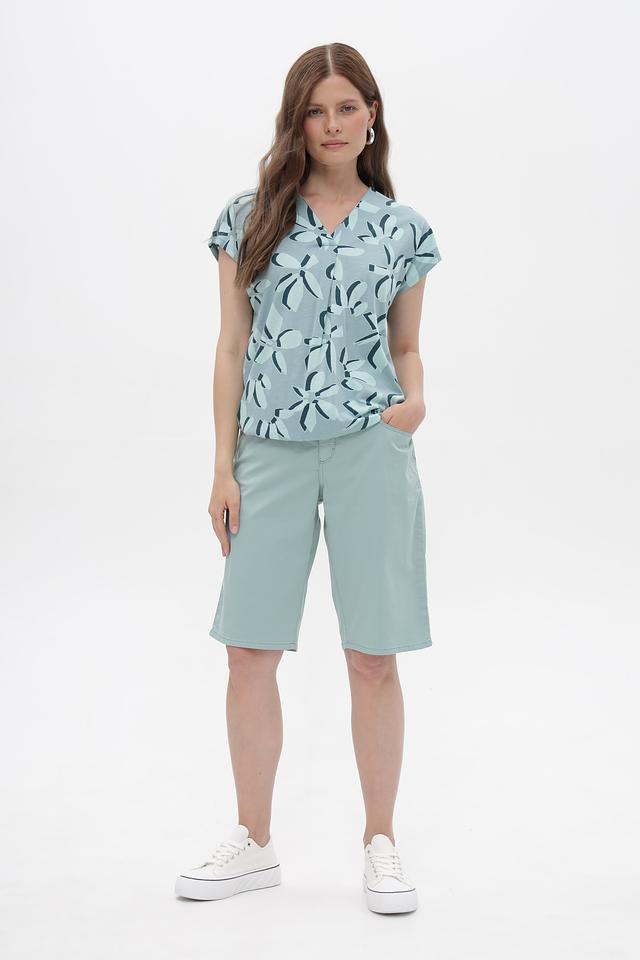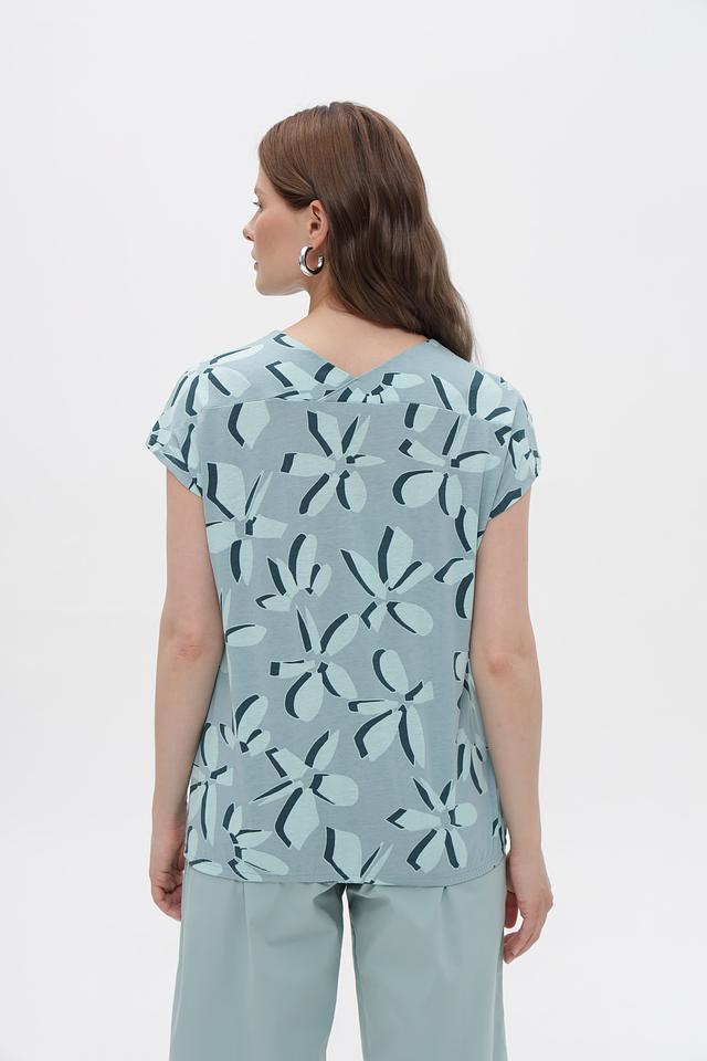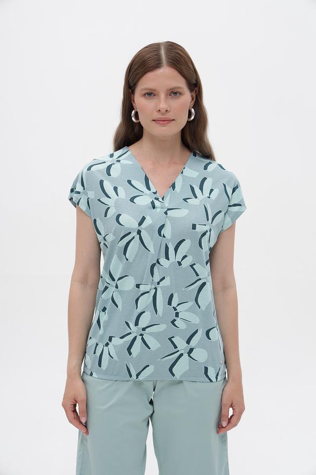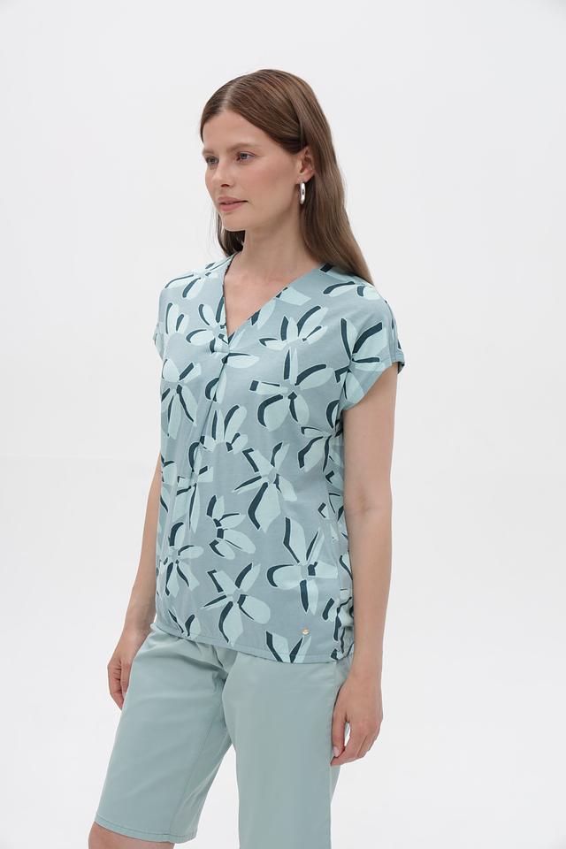Модель имеет V-образный вырез горловины и короткие рукава, что делает ее подходящей для теплой погоды. Блуза выполнена из сочетания хлопка и модала, что обеспечивает мягкость, приятные тактильные ощущения и хорошую воздухопроницаемость.