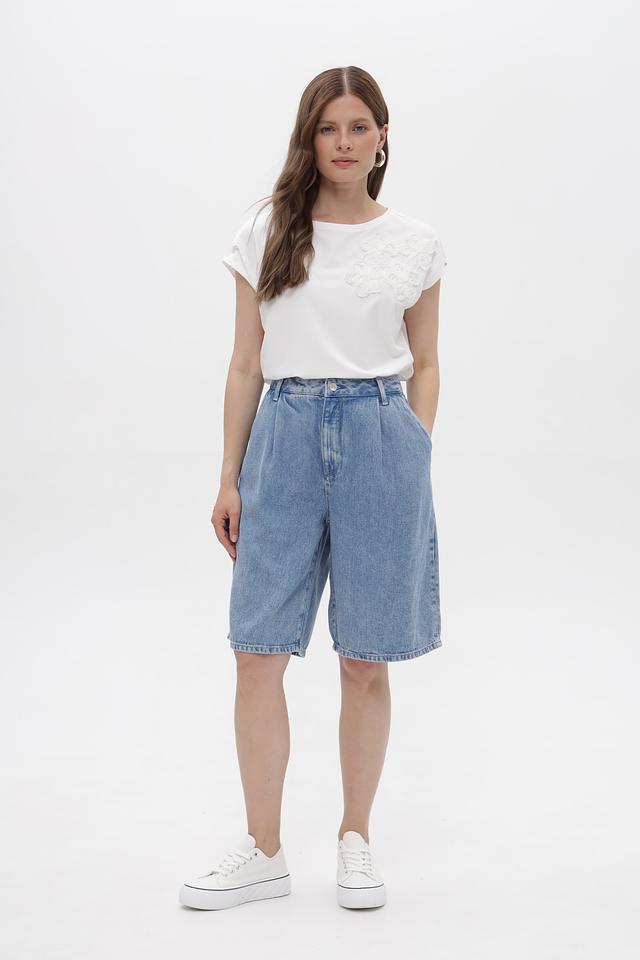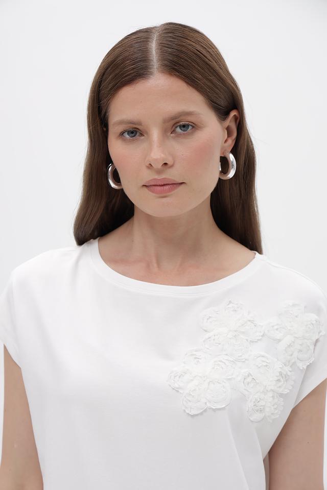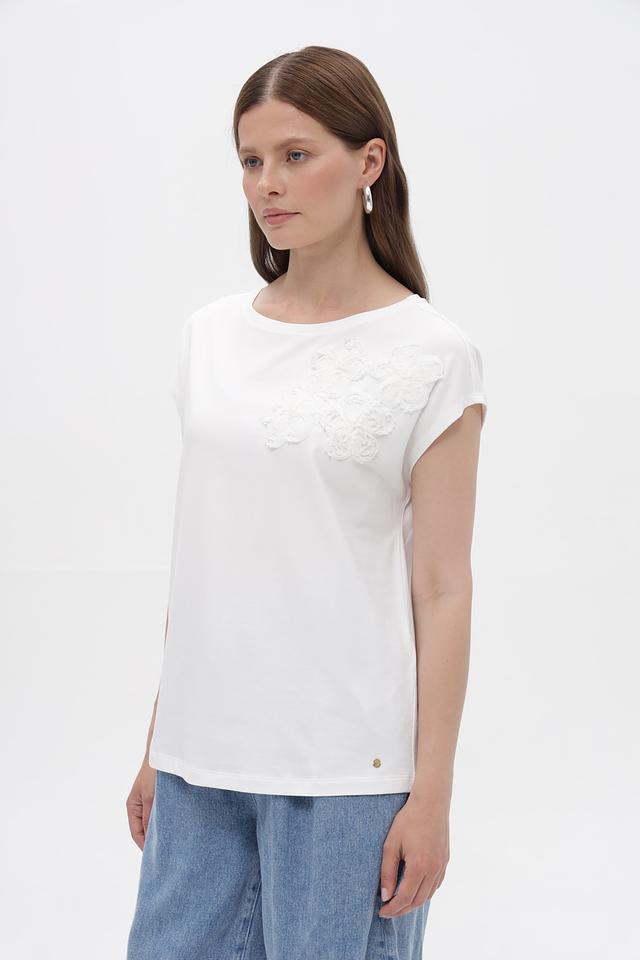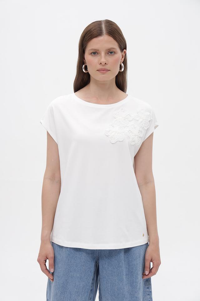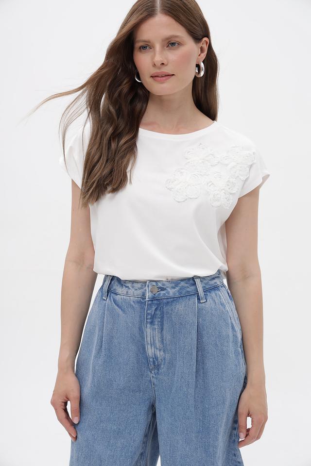 Особенностью модели является деликатное кружево, украшающее плечо, что придает блузке романтичный вид. Крой блузки свободный, что обеспечивает комфорт при носке. Короткие рукава делают ее подходящей для теплой погоды.
