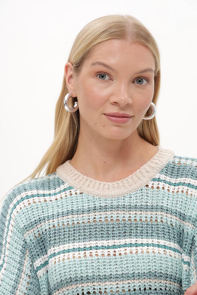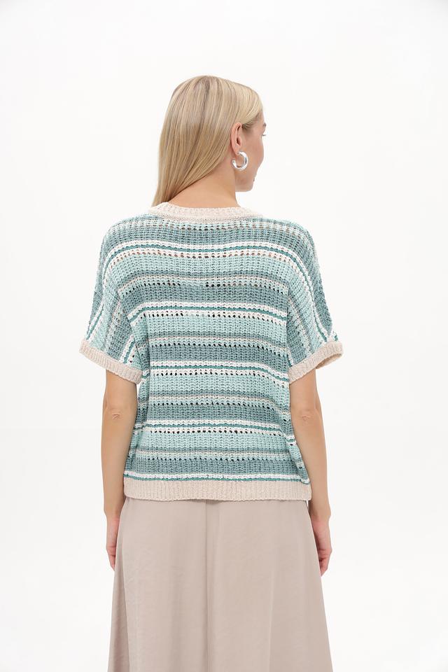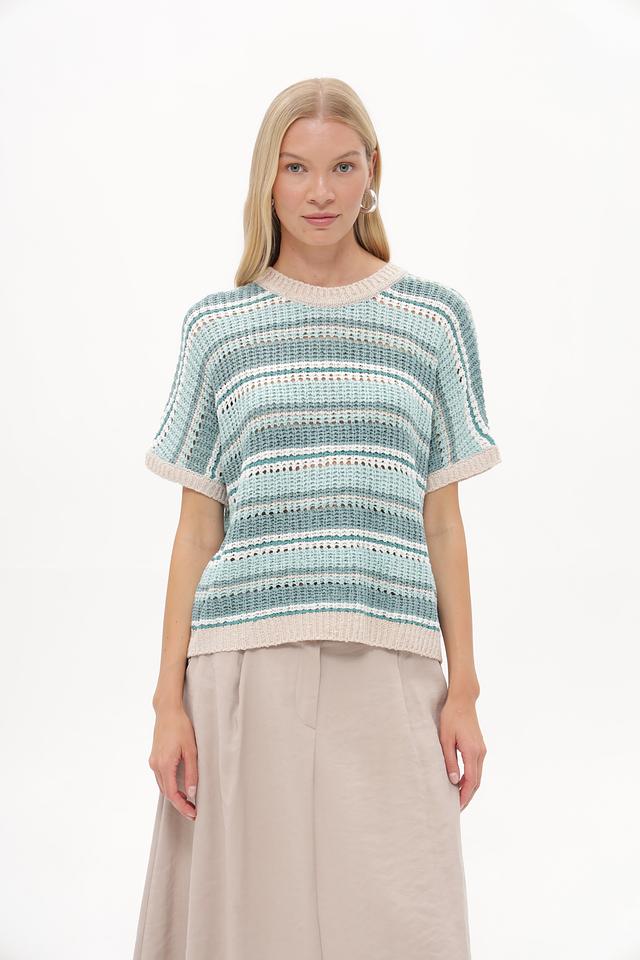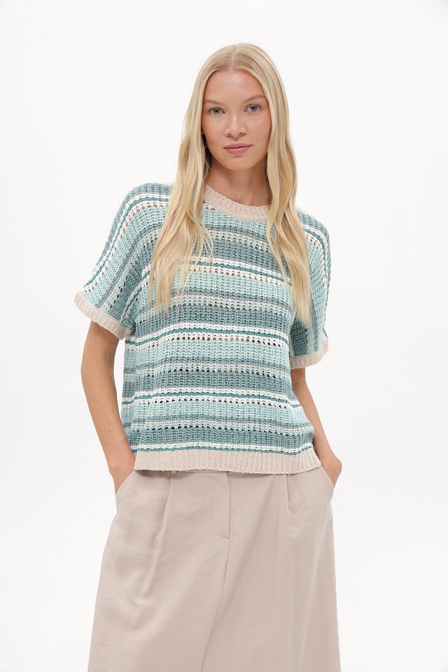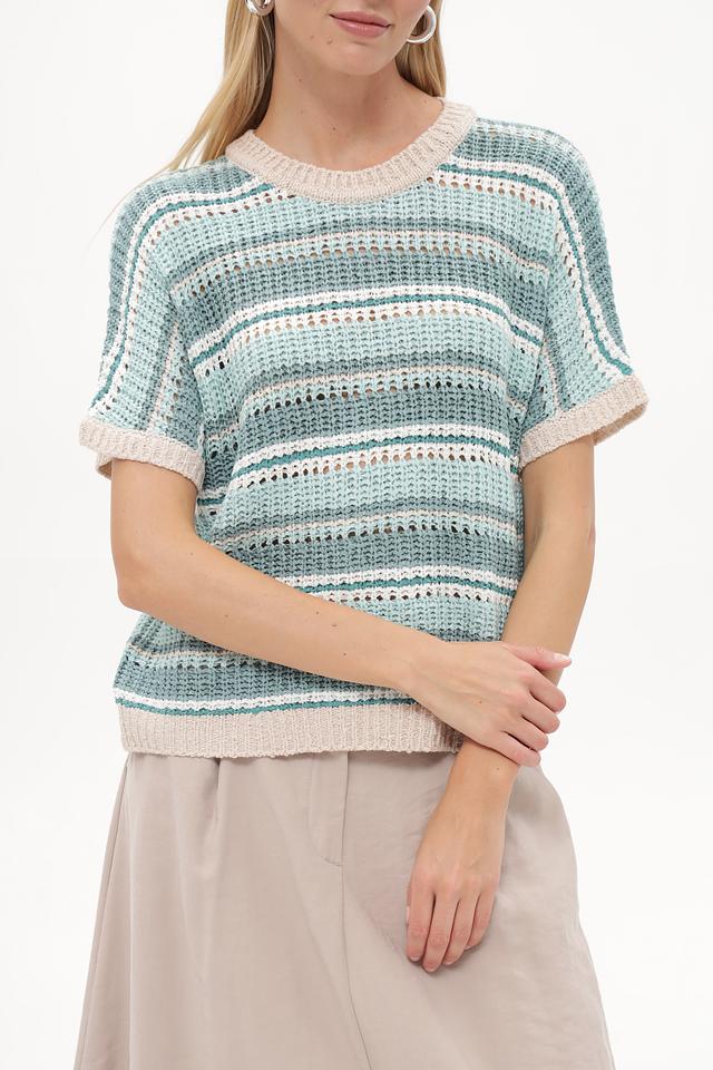 Этот стильный пуловер от Betty and Co выполнен в актуальной полосатой расцветке, сочетающей различные оттенки бирюзового и бежевого. Модель имеет свободный крой и короткие рукава, что делает ее идеальным выбором для теплой погоды.