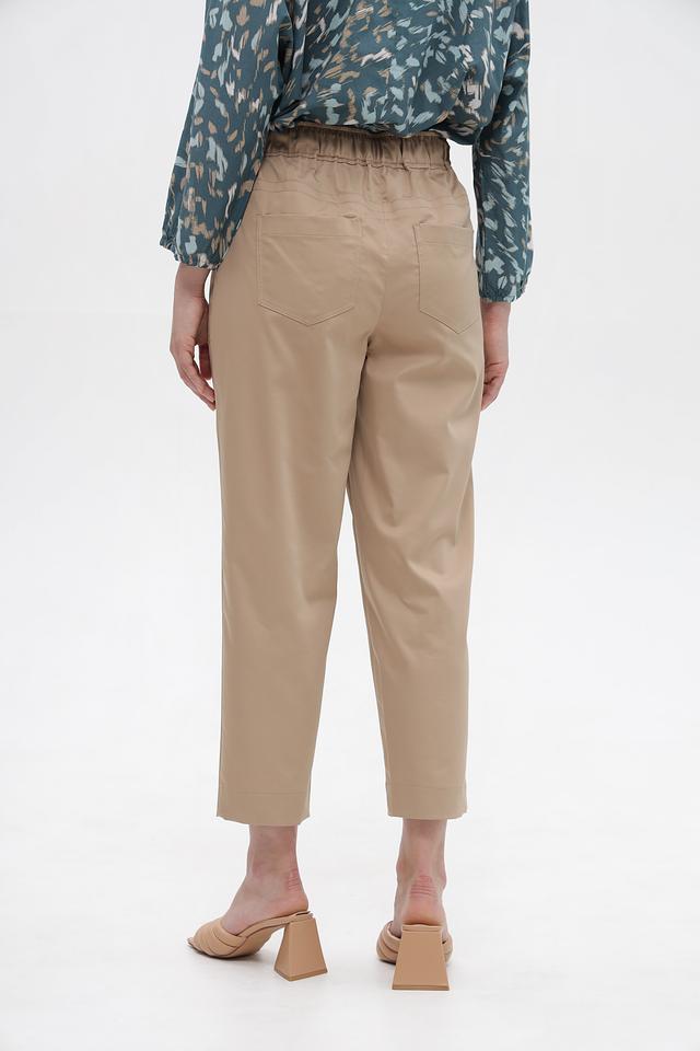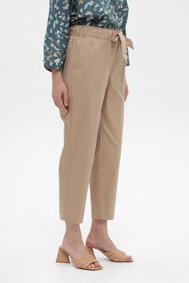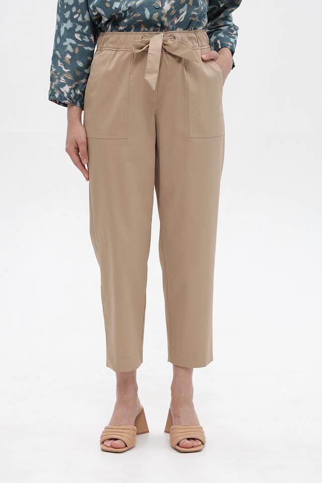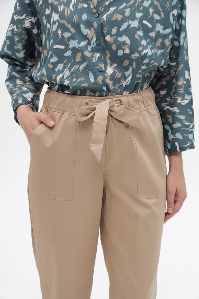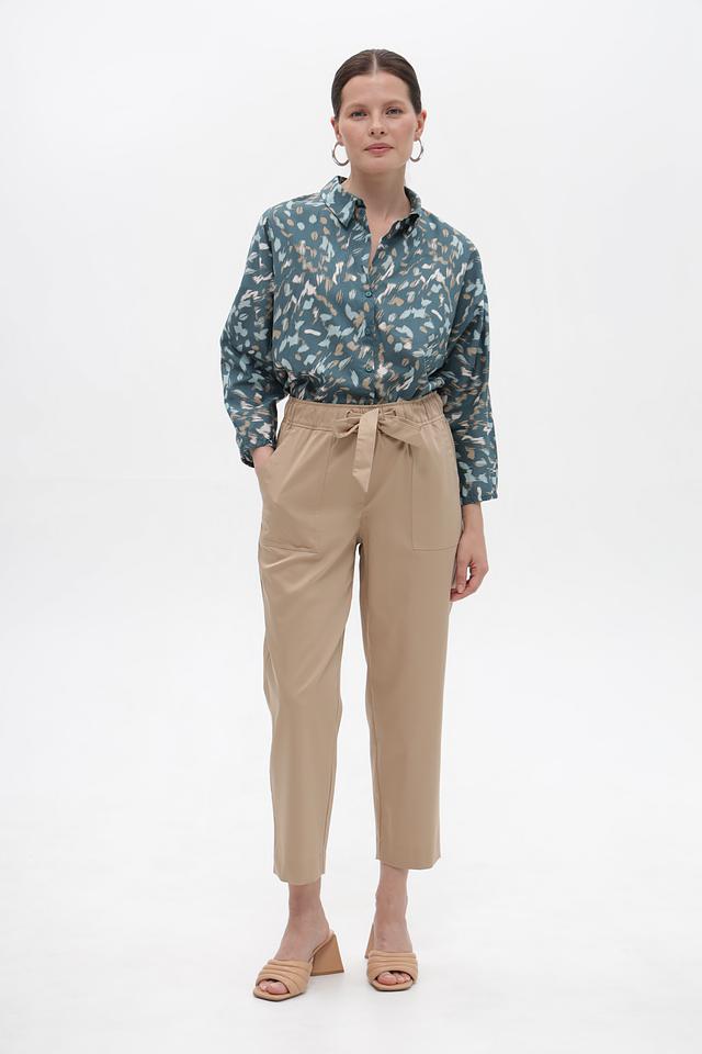 Брюки имеют прямой крой и укороченную длину, что делает их актуальными и модными. Высокая посадка и эластичный пояс с завязками обеспечивают комфортную посадку по фигуре и подчеркивают талию.