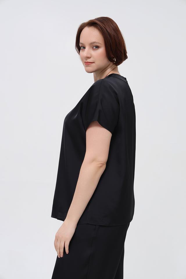 Блузка имеет прямой, свободный крой, который не сковывает движений и позволяет создать непринужденный образ. Круглый вырез горловины добавляет элегантности. Короткие рукава делают блузку идеальным выбором для теплой погоды.
