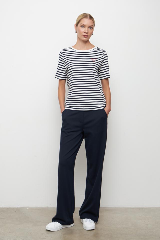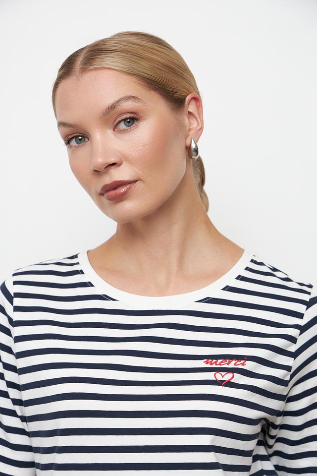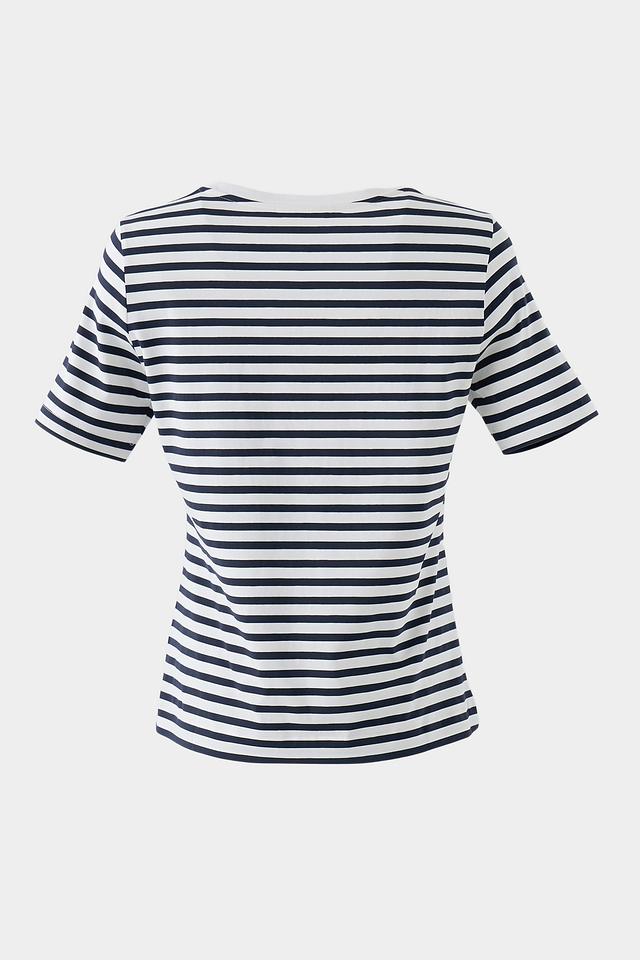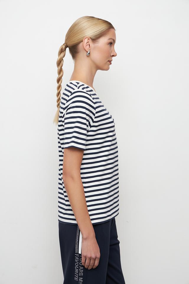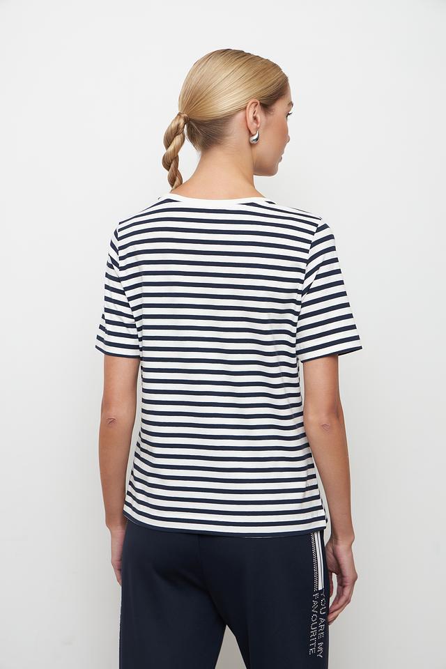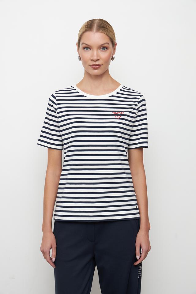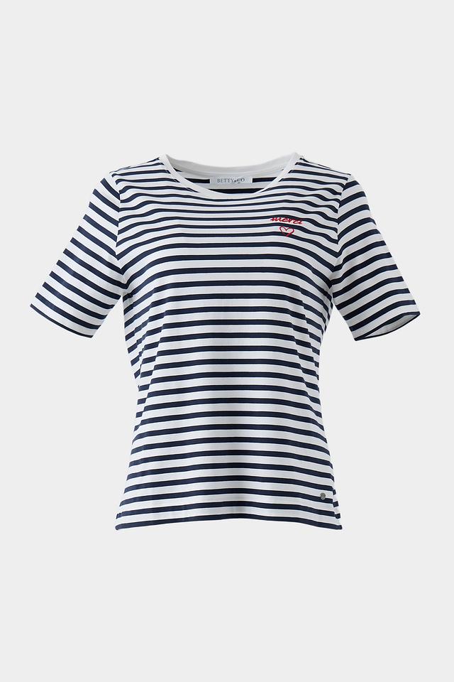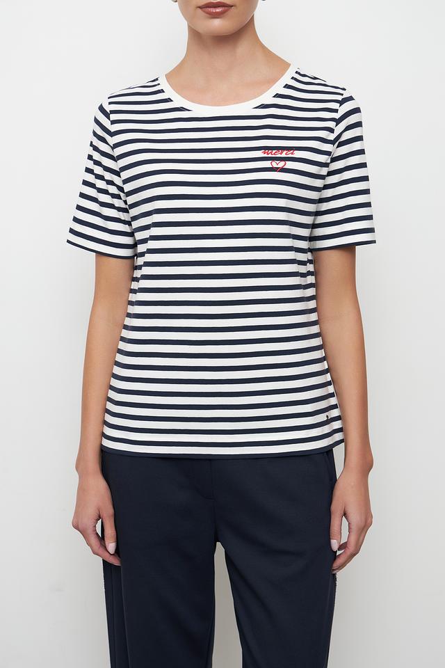 Женская футболка Betty and Co синего и белого цвета в классическую полоску. Модель с коротким рукавом и вышивкой "meri" на груди станет отличным дополнением к вашему гардеробу. Состав: хлопок 95%, эластан 5%
