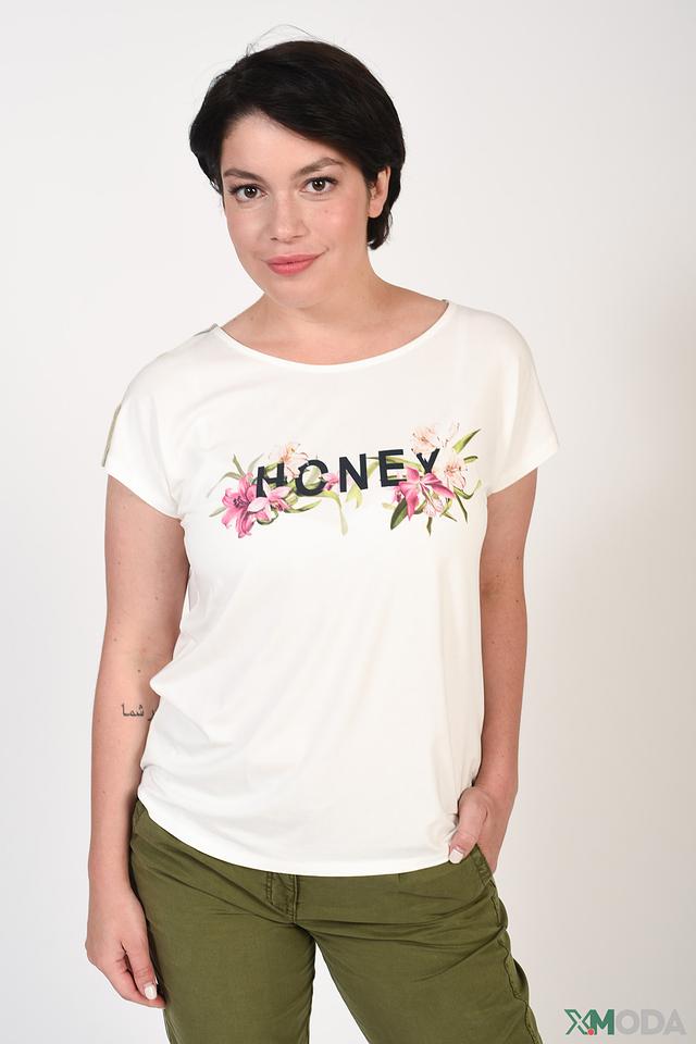 Эта стильная блуза от Betty and Co выполнена в белом цвете и украшена эффектным принтом "Honey" с изображением цветов и надписью. Модель имеет свободный крой, короткие рукава и округлый вырез горловины.