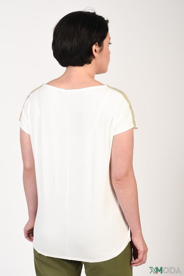 Золотистая отделка вдоль плечевых швов добавляет блузе изысканности и делает ее подходящей как для повседневной носки, так и для создания более нарядного образа. Эта блуза станет прекрасным выбором для женщин, ценящих комфорт, стиль и качество.